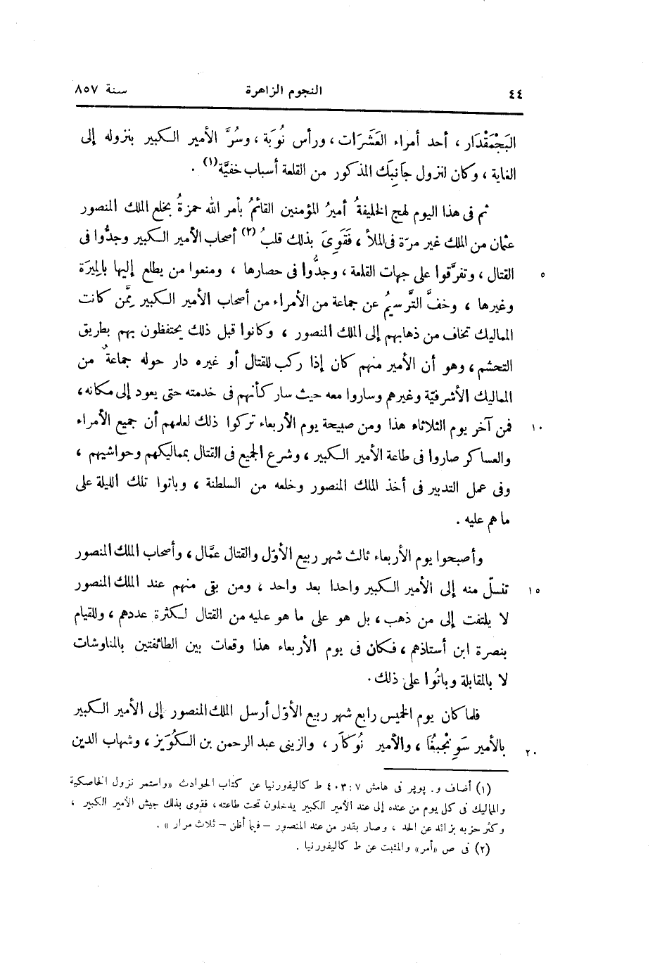 البجمقدار، أحد أمراء العشرات، ورأس نوبة، وسرّ الأمير الكبير بنزوله إلى الغاية، وكان لنزول جانبك المذكور من القلعة أسباب خفيّة «1» .