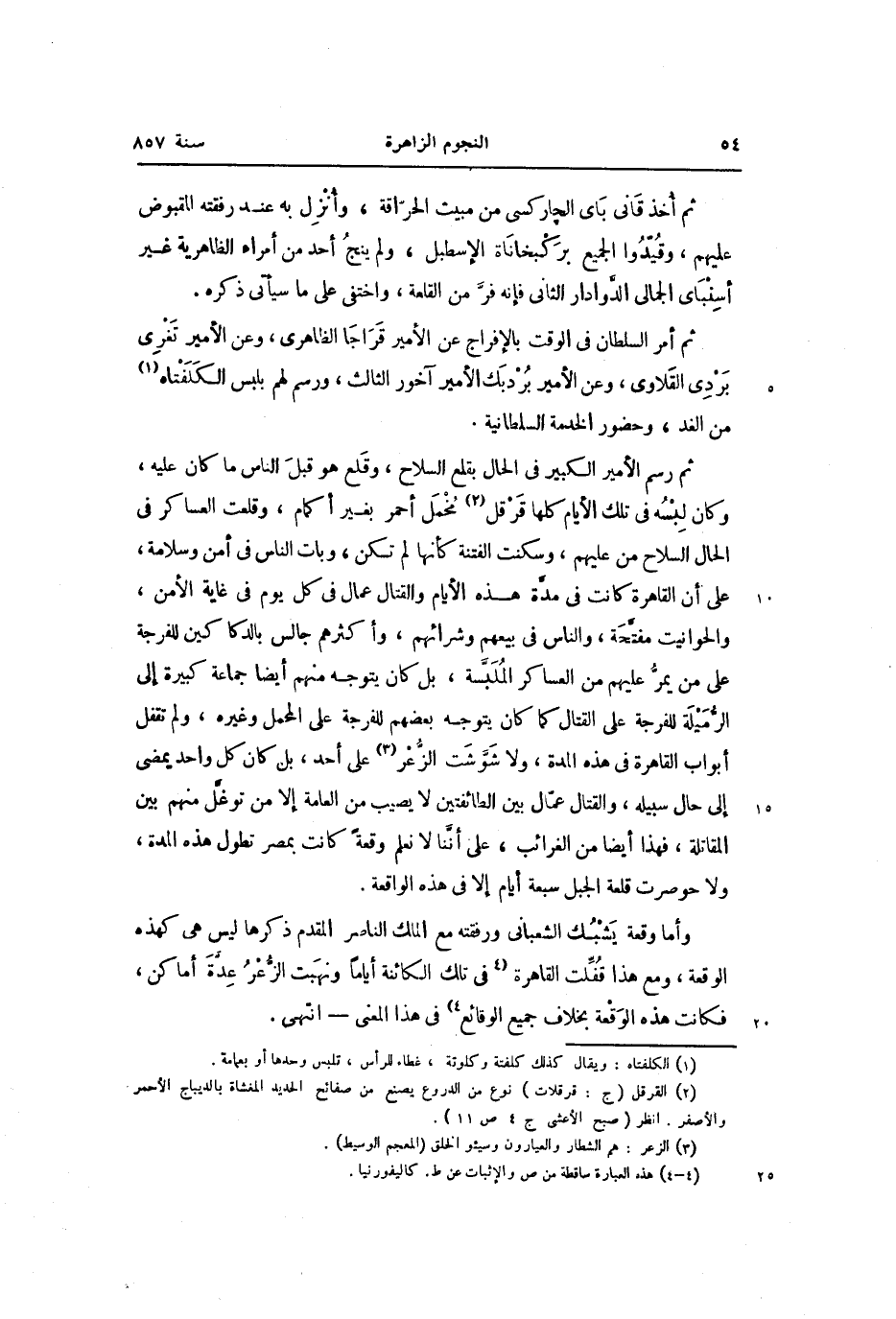 ثم أمر السلطان في الوقت بالإفراج عن الأمير قراجا الظاهرى، وعن الأمير تغرى بردى القلاوى، وعن الأمير بردبك الأمير آخور الثالث، ورسم لهم بلبس الكلفتاه «1» من الغد، وحضور الخدمة السلطانية.
