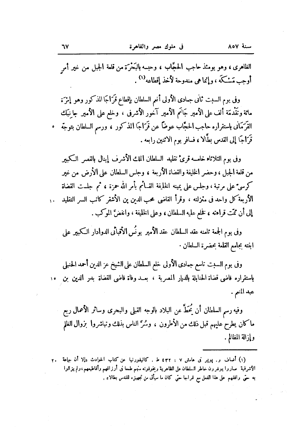 وفي يوم السبت ثانى جمادى الأولى أنعم السلطان بإقطاع قراجا المذكور وهو إمرة مائة وتقدمة ألف على الأمير جانم الأمير آخور الأشرفى، وخلع على الأمير جانبك القرمانى باستقراره حاجب الحجّاب عوضا عن قراجا المذكور، ورسم السلطان بتوجّه قراجا إلى القدس بطّالا، فسافر يوم الاثنين رابعه.