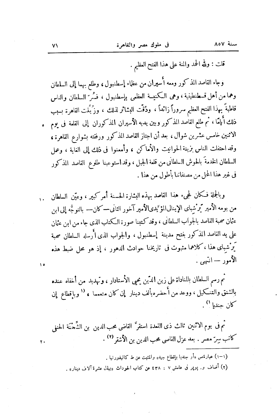 وجاء القاصد المذكور ومعه أسيران من عظماء إسطنبول، وطلع بهما إلى السلطان وهما من أهل قسطنطينية، وهى الكنيسة العظمى بإسطنبول، فسرّ السلطان والناس قاطبة بهذا الفتح العظيم سرورا زائدا، ودقّت البشائر لذلك، وزيّنت القاهرة بسبب ذلك أياما، ثم طلع القاصد المذكور وبين يديه الأسيران المذكوران إلى القلعة في يوم الاثنين خامس عشرين شوال، بعد أن اجتاز القاصد المذكور ورفقته بشوارع القاهرة، وقد احتفلت الناس بزينة الحوانيت والأماكن، وأمعنوا في ذلك إلى الغاية، وعمل السلطان الخدمة بالحوش السلطانى من قلعة الجبل، وقد استوعبنا طلوع القاصد المذكور فى غير هذا المحل من مصنفاتنا بأطول من هذا.