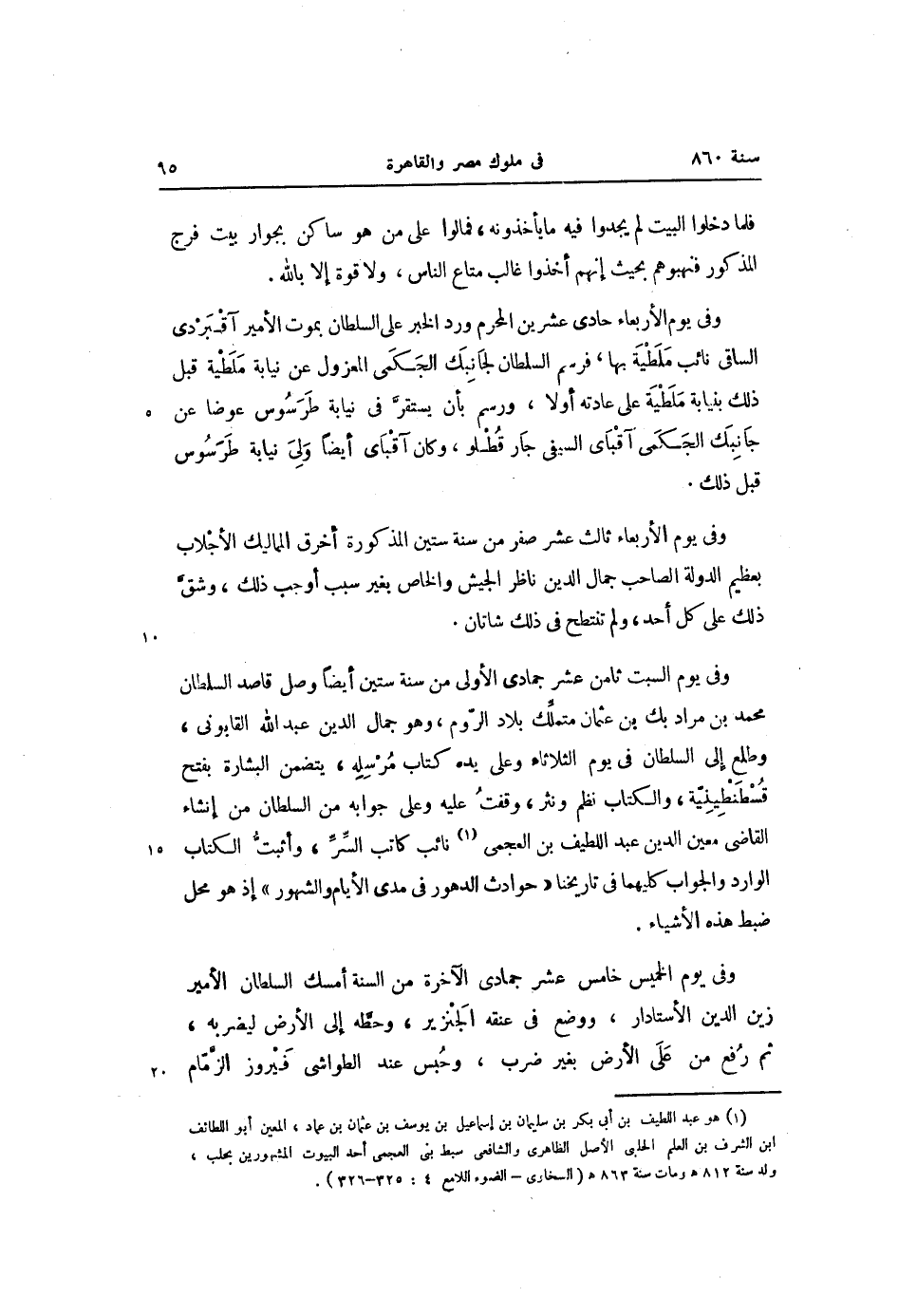 وفي يوم السبت ثامن عشر جمادى الأولى من سنة ستين أيضا وصل قاصد السلطان محمد بن مراد بك بن عثمان متملّك بلاد الرّوم، وهو جمال الدين عبد الله القابونى، وطلع إلى السلطان في يوم الثلاثاء وعلى يده كتاب مرسله، يتضمن البشارة بفتح قسطنطينيّة، والكتاب نظم ونثر، وقفت عليه وعلى جوابه من السلطان من إنشاء القاضى معين الدين عبد اللطيف بن العجمى «1» نائب كاتب السّرّ، وأثبتّ الكتاب الوارد والجواب كليهما في تاريخنا «حوادث الدهور في مدى الأيام والشهور» إذ هو محل ضبط هذه الأشياء.
