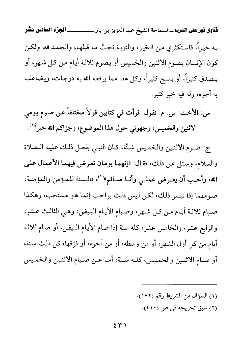 ج: صوم الاثنين والخميس سُنَّة، كان النبي يفعل ذلك عليه الصلاة والسلام، وسئل عن ذلك، فقال: «إنهما يومان تعرض فيهما الأعمال على الله، وأحب أن يعرض عملي وأنا صائم» (¬1) فالسنة للمؤمن والمؤمنة، صومهما إذا تيسر ذلك، لكن ليس ذلك بواجب إنما هو مستحب، وهكذا صيام ثلاثة أيام من كل شهر، وصيام الأيام البيض: وهي الثالث عشر، والرابع عشر، والخامس عشر، كله سنة إذا صام الأيام البيض، أو صام ثلاثة أيام من كل أول الشهر، أو من وسطه، أو من آخره، أو فرَّقها، كل ذلك سنة، أو صام الاثنين والخميس، كله سنة، أما عن صيام الاثنين والخميس
