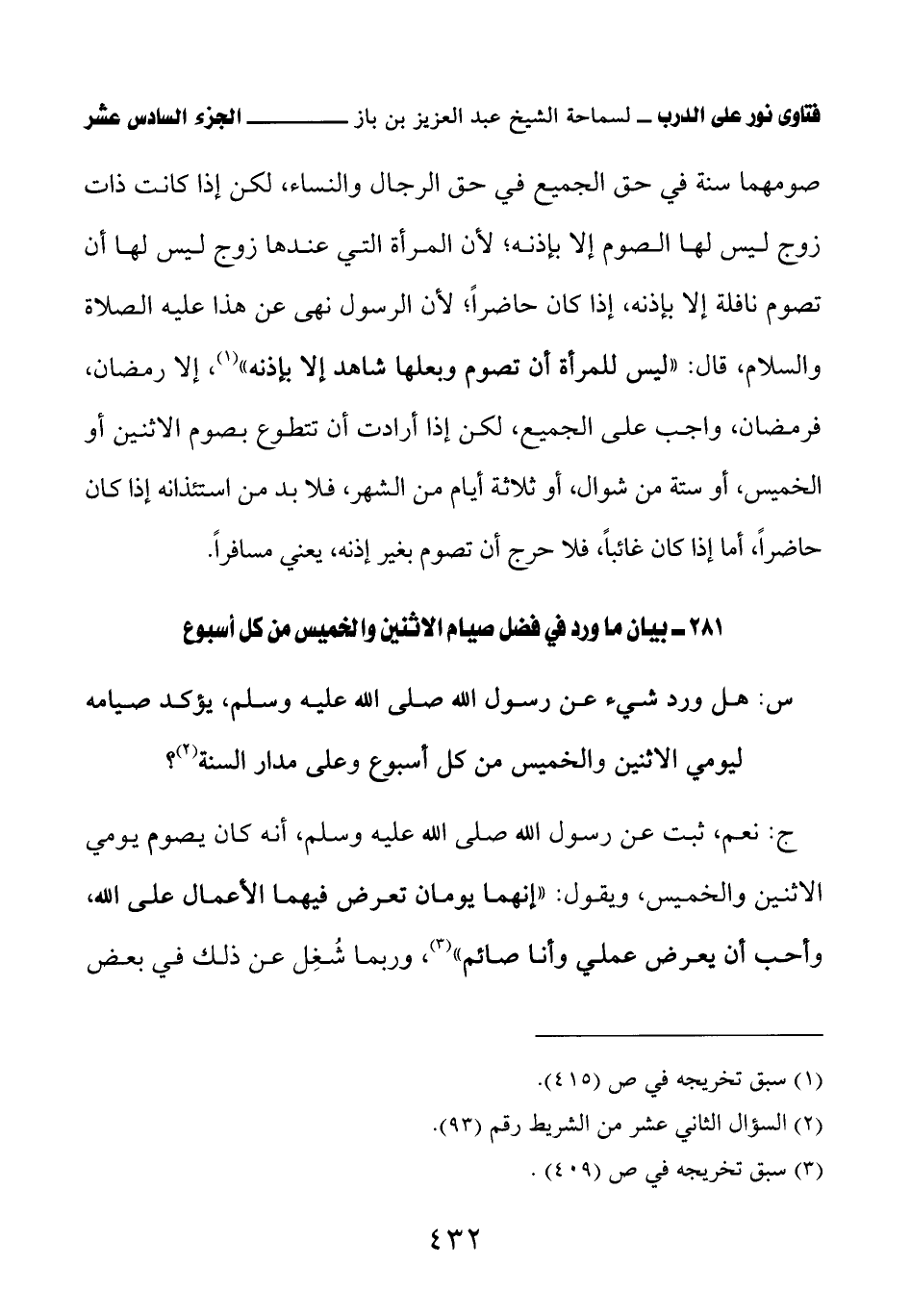 صومهما سنة في حق الجميع في حق الرجال والنساء، لكن إذا كانت ذات زوج ليس لها الصوم إلا بإذنه؛ لأن المرأة التي عندها زوج ليس لها أن تصوم نافلة إلا بإذنه، إذا كان حاضرًا؛ لأن الرسول نهى عن هذا عليه الصلاة والسلام، قال: «ليس للمرأة أن تصوم وبعلها شاهد إلا بإذنه» (¬1) إلا رمضان، فرمضان، واجب على الجميع، لكن إذا أرادت أن تتطوع بصوم الاثنين أو الخميس، أو ستة من شوال، أو ثلاثة أيام من الشهر، فلا بد من استئذانه إذا كان حاضرًا، أما إذا كان غائبًا، فلا حرج أن تصوم بغير إذنه، يعني مسافرًا.