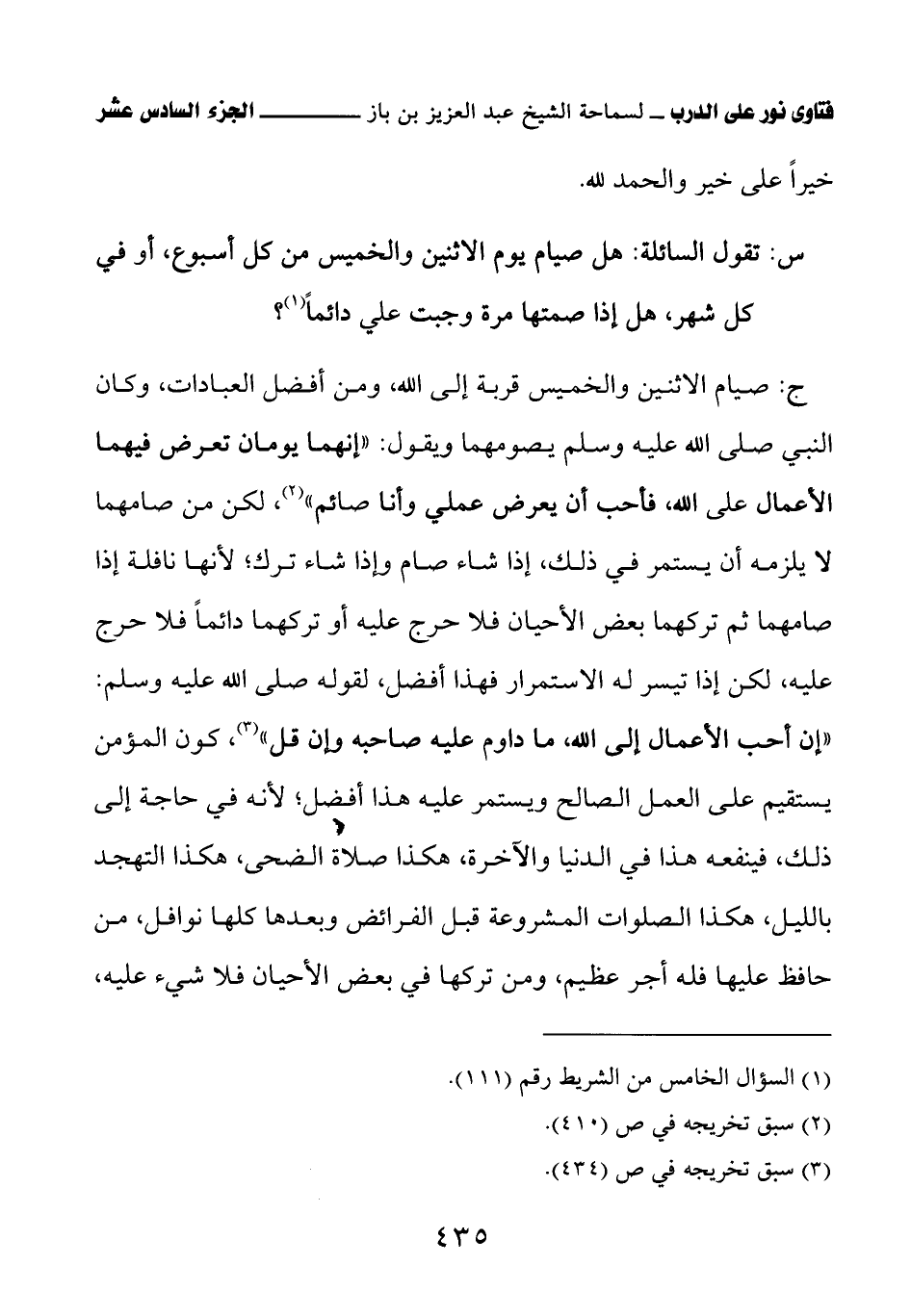 ج: صيام الاثنين والخميس قربة إلى الله، ومن أفضل العبادات، وكان النبي صلى الله عليه وسلم يصومهما ويقول: «إنهما يومان تعرض فيهما الأعمال على الله، فأحب أن يعرض عملي وأنا صائم» (¬1) لكن من صامهما لا يلزمه أن يستمر في ذلك، إذا شاء صام وإذا شاء ترك؛ لأنها نافلة إذا صامهما ثم تركهما بعض الأحيان فلا حرج عليه أو تركهما دائمًا فلا حرج عليه، لكن إذا تيسر له الاستمرار فهذا أفضل، لقوله صلى الله عليه وسلم: «إن أحب الأعمال إلى الله، ما داوم عليه صاحبه وإن قل» (¬2) كون المؤمن يستقيم على العمل الصالح ويستمر عليه هذا أفضل؛ لأنه في حاجة إلى ذلك، فينفعه هذا في الدنيا والآخرة، هكذا صلاة الضحى، هكذا التهجد بالليل، هكذا الصلوات المشروعة قبل الفرائض وبعدها كلها نوافل، من حافظ عليها فله أجر عظيم، ومن تركها في بعض الأحيان فلا شيء عليه،