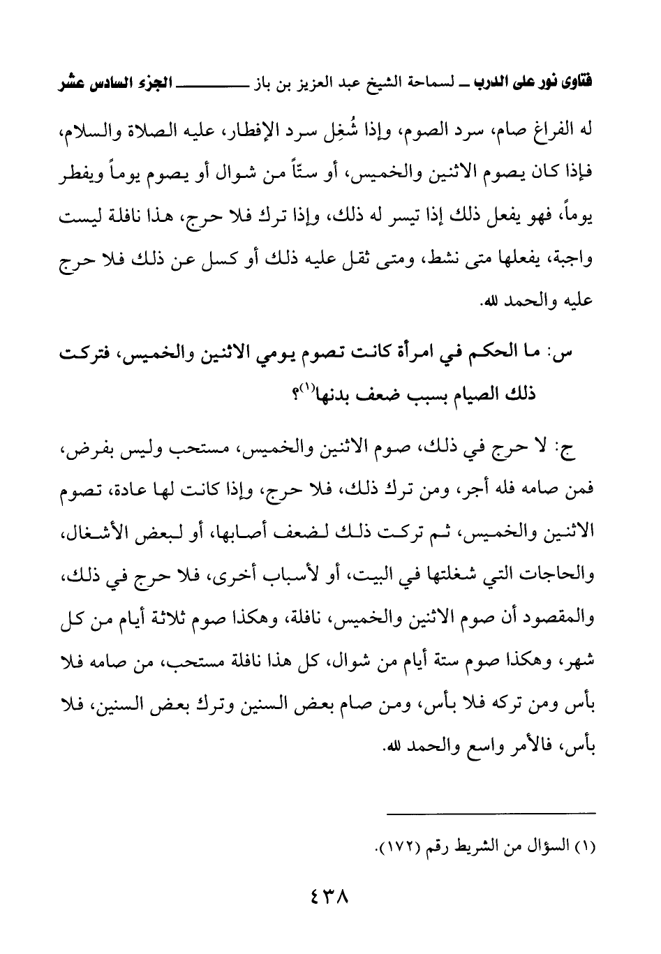 ج: لا حرج في ذلك، صوم الاثنين والخميس، مستحب وليس بفرض، فمن صامه فله أجر، ومن ترك ذلك، فلا حرج، وإذا كانت لها عادة، تصوم الاثنين والخميس، ثم تركت ذلك لضعف أصابها، أو لبعض الأشغال، والحاجات التي شغلتها في البيت، أو لأسباب أخرى، فلا حرج في ذلك، والمقصود أن صوم الاثنين والخميس، نافلة، وهكذا صوم ثلاثة أيام من كل شهر، وهكذا صوم ستة أيام من شوال، كل هذا نافلة مستحب، من صامه فلا بأس ومن تركه فلا بأس، ومن صام بعض السنين وترك بعض السنين، فلا بأس، فالأمر واسع والحمد لله.