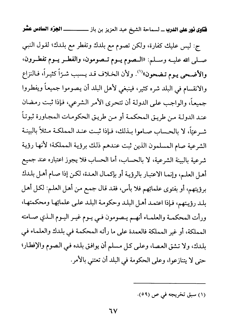 ج: ليس عليك كفارة، ولكن تصوم مع بلدك وتفطر مع بلدك؛ لقول النبي صلى الله عليه وسلم: «الصوم يوم تصومون، والفطر يوم تفطرون، والأضحى يوم تضحون» (¬1) ولأن الخلاف قد يسبب شرًّا كثيرًا، فالنزاع والانقسام في البلد شره كثير، فينبغي لأهل البلد أن يصوموا جميعًا ويفطروا جميعًا، والواجب على الدولة أن تتحرى الأمر الشرعي، فإذا ثبت رمضان عند الدولة من طريق المحكمة أو من طريق الحكومات المجاورة ثبوتًا شرعيًّا، لا بالحساب صاموا بذلك، فإذا ثبت عند المملكة مثلاً بالبينة الشرعية صام المسلمون الذين ثبت عندهم ذلك برؤية المملكة؛ لأنها رؤية شرعية بالبينة الشرعية، لا بالحساب، أما الحساب فلا يجوز اعتباره عند جميع أهل العلم، وإنما الاعتبار بالرؤية أو بإكمال العدة، لكن إذا صام أهل بلدك برؤيتهم، أو بفتوى علمائِهم فلا بأس، فقد قال جمع من أهل العلم: لكل أهل بلد رؤيتهم، فإذا اعتمد أهل البلد وحكومة البلد على علمائِها ومحكمتها، ورأت المحكمة والعلماء أنهم يصومون في يوم غير اليوم الذي صامته المملكة، أو غير المملكة فالعمدة على ما رأته المحكمة في بلدك والعلماء في بلدك، ولا تشق العصا، وعلى كل مسلم أن يوافق بلده في الصوم والإفطار؛ حتى لا يتنازعوا، وعلى الحكومة في البلد أن تعتني بالأمر.