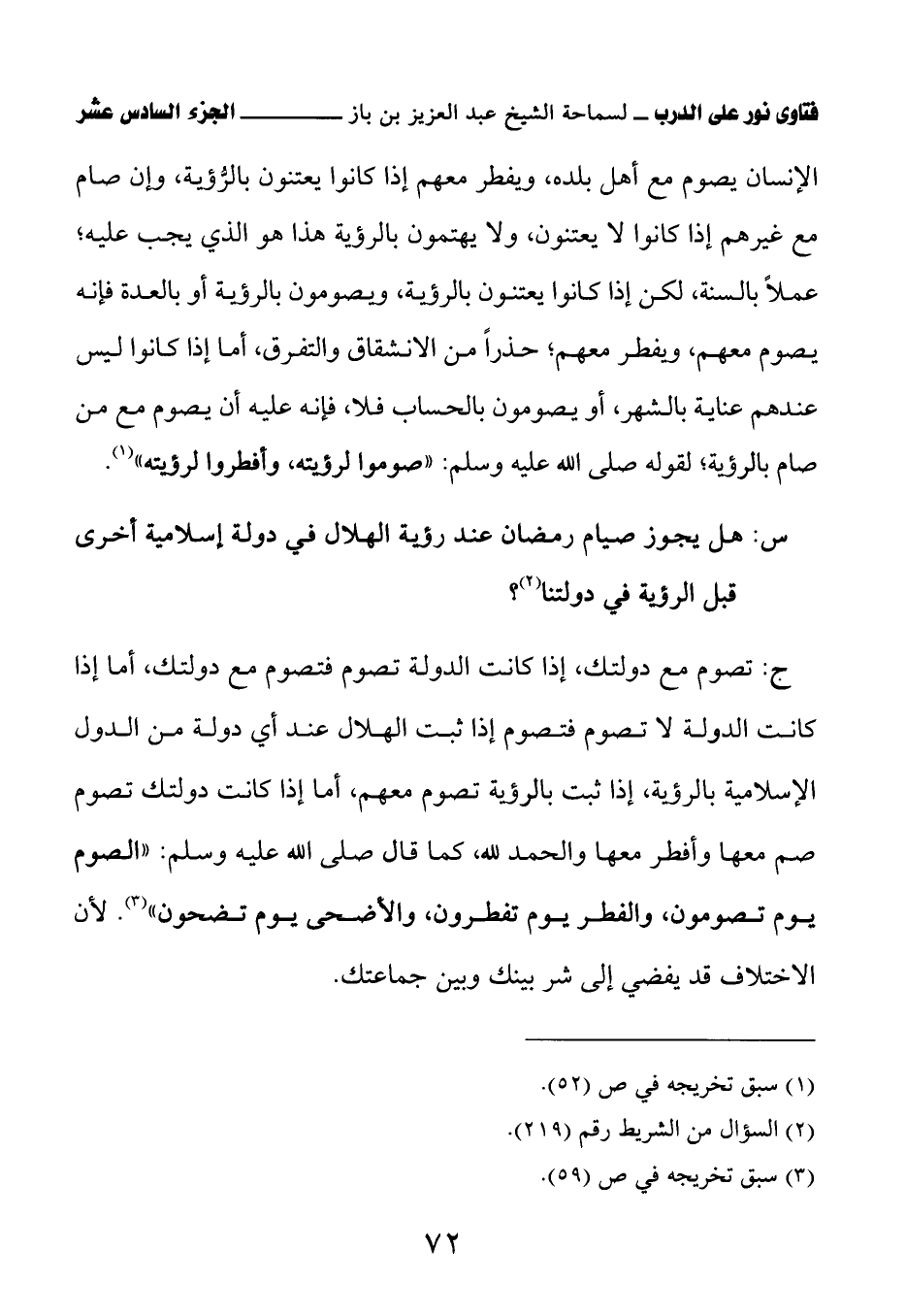 ج: تصوم مع دولتك، إذا كانت الدولة تصوم فتصوم مع دولتك، أما إذا كانت الدولة لا تصوم فتصوم إذا ثبت الهلال عند أي دولة من الدول الإسلامية بالرؤية، إذا ثبت بالرؤية تصوم معهم، أما إذا كانت دولتك تصوم صم معها وأفطر معها والحمد لله، كما قال صلى الله عليه وسلم: «الصوم يوم تصومون، والفطر يوم تفطرون، والأضحى يوم تضحون» (¬2) لأن الاختلاف قد يفضي إلى شر بينك وبين جماعتك.