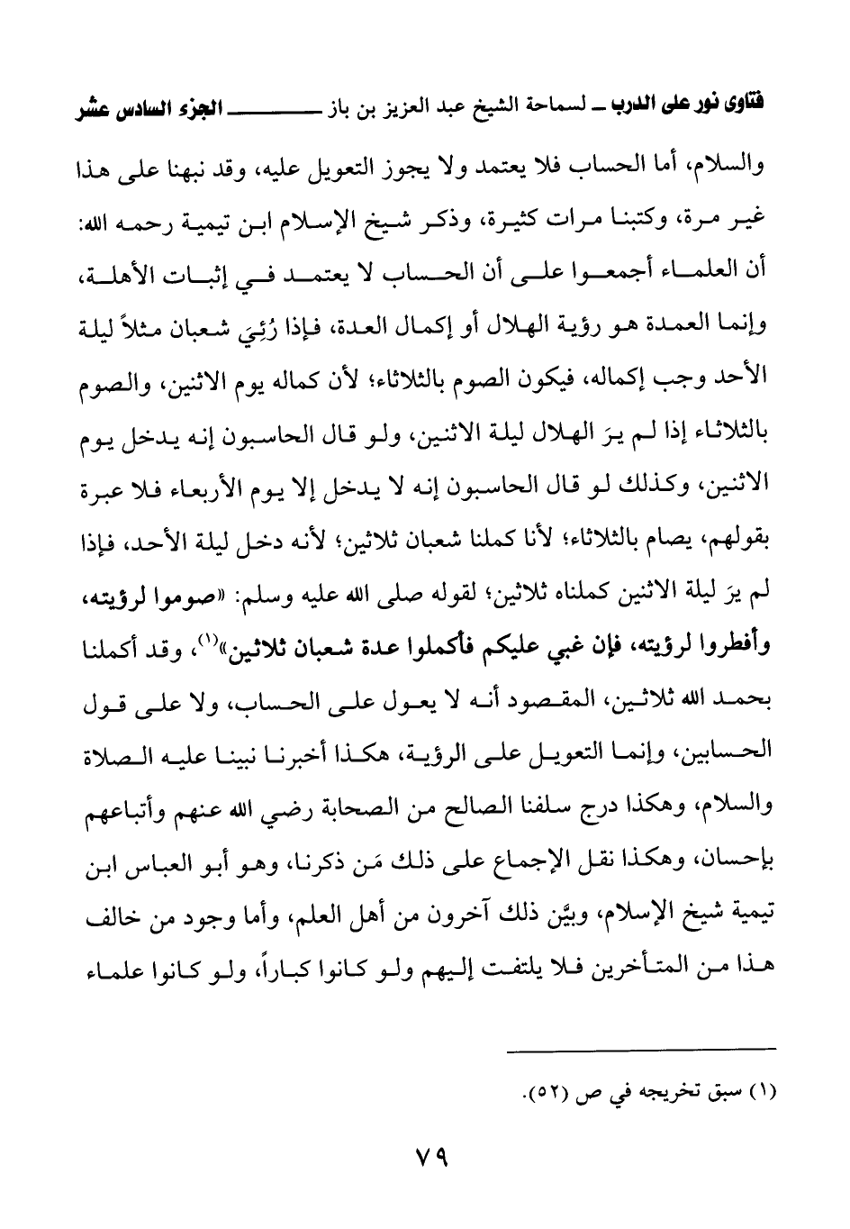 والسلام، أما الحساب فلا يعتمد ولا يجوز التعويل عليه، وقد نبهنا على هذا غير مرة، وكتبنا مرات كثيرة، وذكر شيخ الإسلام ابن تيمية رحمه الله: أن العلماء أجمعوا على أن الحساب لا يعتمد في إثبات الأهلة، وإنما العمدة هو رؤية الهلال أو إكمال العدة، فإذا رُئِيَ شعبان مثلاً ليلة الأحد وجب إكماله، فيكون الصوم بالثلاثاء؛ لأن كماله يوم الاثنين، والصوم بالثلاثاء إذا لم يرَ الهلال ليلة الاثنين، ولو قال الحاسبون إنه يدخل يوم الاثنين، وكذلك لو قال الحاسبون إنه لا يدخل إلا يوم الأربعاء فلا عبرة بقولهم، يصام بالثلاثاء؛ لأنا كملنا شعبان ثلاثين؛ لأنه دخل ليلة الأحد، فإذا لم يرَ ليلة الاثنين كملناه ثلاثين؛ لقوله صلى الله عليه وسلم: «صوموا لرؤيته، وأفطروا لرؤيته، فإن غبي عليكم فأكملوا عدة شعبان ثلاثين» (¬1) وقد أكملنا بحمد الله ثلاثين، المقصود أنه لا يعول على الحساب، ولا على قول الحسابين، وإنما التعويل على الرؤية، هكذا أخبرنا نبينا عليه الصلاة والسلام، وهكذا درج سلفنا الصالح من الصحابة رضي الله عنهم وأتباعهم بإحسان، وهكذا نقل الإجماع على ذلك مَن ذكرنا، وهو أبو العباس ابن تيمية شيخ الإسلام، وبيَّن ذلك آخرون من أهل العلم، وأما وجود من خالف هذا من المتأخرين فلا يلتفت إليهم ولو كانوا كبارًا، ولو كانوا علماء