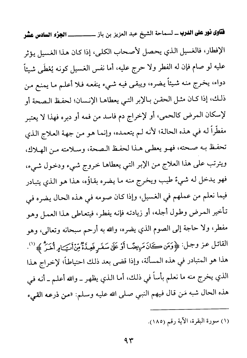 الإفطار، فالغسيل الذي يحصل لأصحاب الكلى، إذا كان هذا الغسيل يؤثر عليه لو صام فإن له الفطر ولا حرج عليه، أما نفس الغسيل كونه يُعْطَى شيئًا دواء، يخرج منه شيئًا يضره، ويبقى فيه شيء ينفعه فلا أعلم ما يمنع من ذلك، إذا كان مثل الحقن بالإبر التي يعطاها الإنسان؛ لحفظ الصحة أو لإسكان المرض كالحمى، أو لإخراج دم فاسد من فمه أو دبره فهذا لا يعتبر مفطّرًا له في هذه الحالة؛ لأنه لم يتعمده، وإنما هو من جهة العلاج الذي تحفظ به صحته، فهو يعطى هذا لحفظ الصحة، وسلامته من الهلاك، ويترتب على هذا العلاج من الإبر التي يعطاها خروج شيء ودخول شيء، فهو يدخل له شيءٌ طيب ويخرج منه ما يضره بقاؤُه، هذا هو الذي يتبادر فيما نعلم من عملهم في الغسيل، وإذا كان صومه في هذه الحال يضره في تأخير المرض وطول أجله، أو زيادته فإنه يفطر، فيتعاطى هذا العمل وهو مفطر، ولا حاجة إلى الصوم الذي يضره، والله به أرحم سبحانه وتعالى، وهو القائل عز وجل: {وَمَنْ كَانَ مَرِيضًا أَوْ عَلَى سَفَرٍ فَعِدَّةٌ مِنْ أَيَّامٍ أُخَرَ}. هذا هو المتبادر في هذه المسألة، وإذا قضى بعد ذلك احتياطا؛ لإخراج هذا الذي يخرج منه ما نعلم بأسًا في ذلك، أما الذي يظهر - والله أعلم - أنه في هذه الحال شبه مَن قال فيهم النبي صلى الله عليه وسلم: «من ذرعه القيء