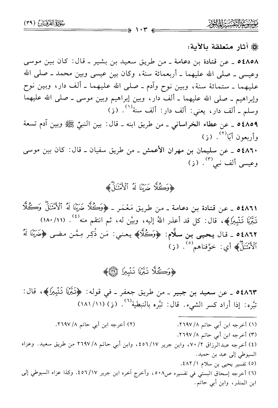 ٥٤٨٦١ - عن قتادة بن دعامة -من طريق مَعْمَر- {وكلا ضربنا له الامثال وكلا تبرنا تتبيرا}، قال: كل قد أعذر اللهُ إليه، وبيَّن له، ثم انتقم منه (¬٤). (١١/ ١٨٠)