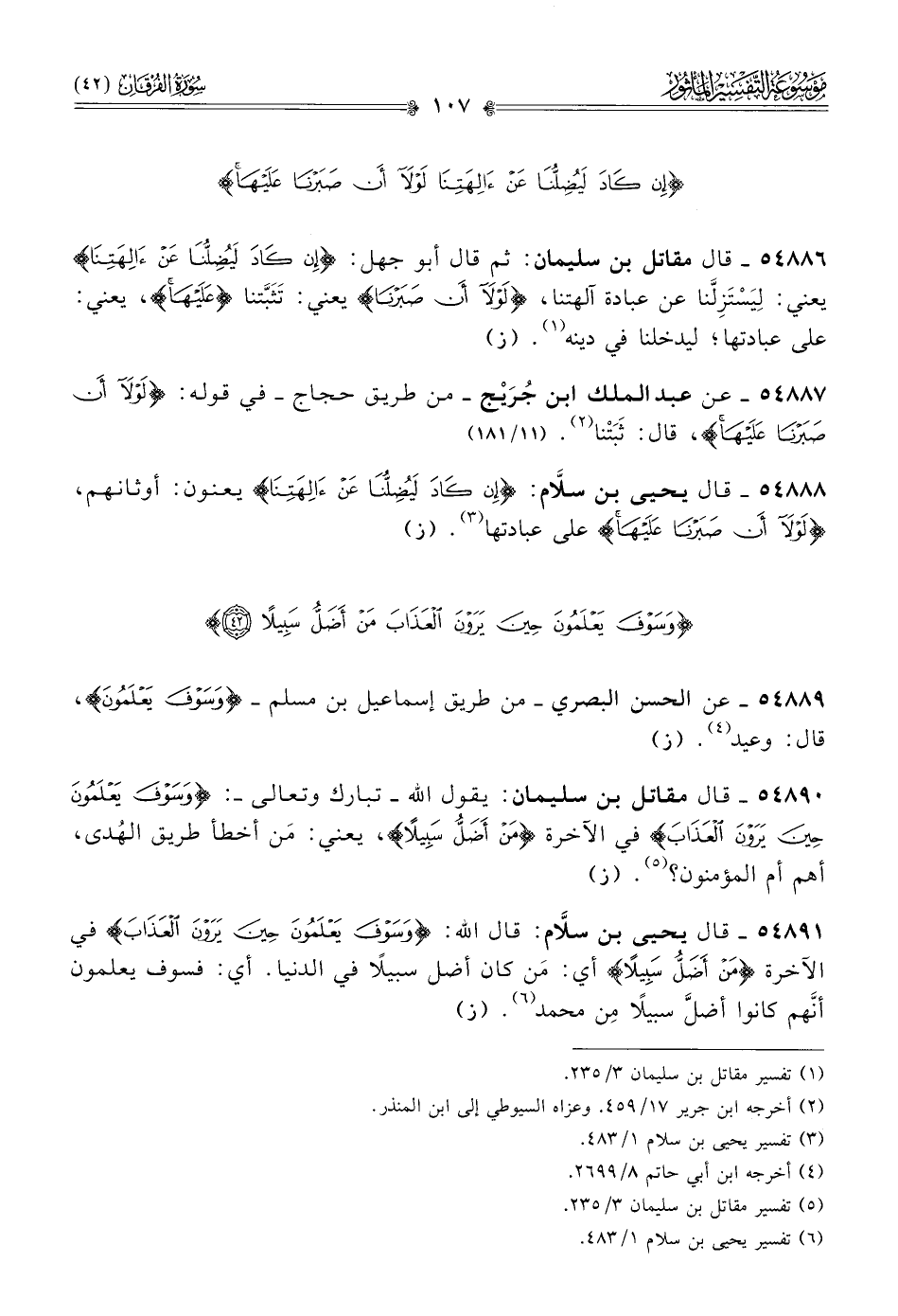 ٥٤٨٩١ - قال يحيى بن سلّام: قال الله: {وسوف يعلمون حين يرون العذاب} في الآخرة {من أضل سبيلا} أي: مَن كان أضل سبيلًا في الدنيا. أي: فسوف يعلمون أنّهم كانوا أضلَّ سبيلًا مِن محمد (¬٦). (ز)