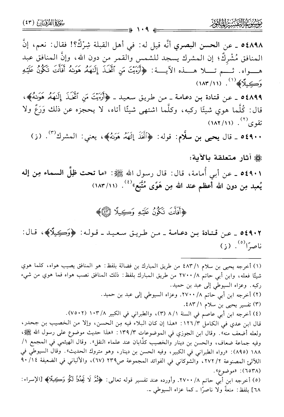 ٥٤٨٩٨ - عن الحسن البصري أنّه قيل له: في أهل القبلة شِرْكٌ؟! فقال: نعم، إنّ المنافق مُشْرِكٌ؛ إن المشرك يسجد للشمس والقمر من دون الله، وإنّ المنافق عبد هواه. ثم تلا هذه الآية: {أرأيت من اتخذ الهه هواه أفأنت تكون عليه وكيلا} (¬١). (١١/ ١٨٣)