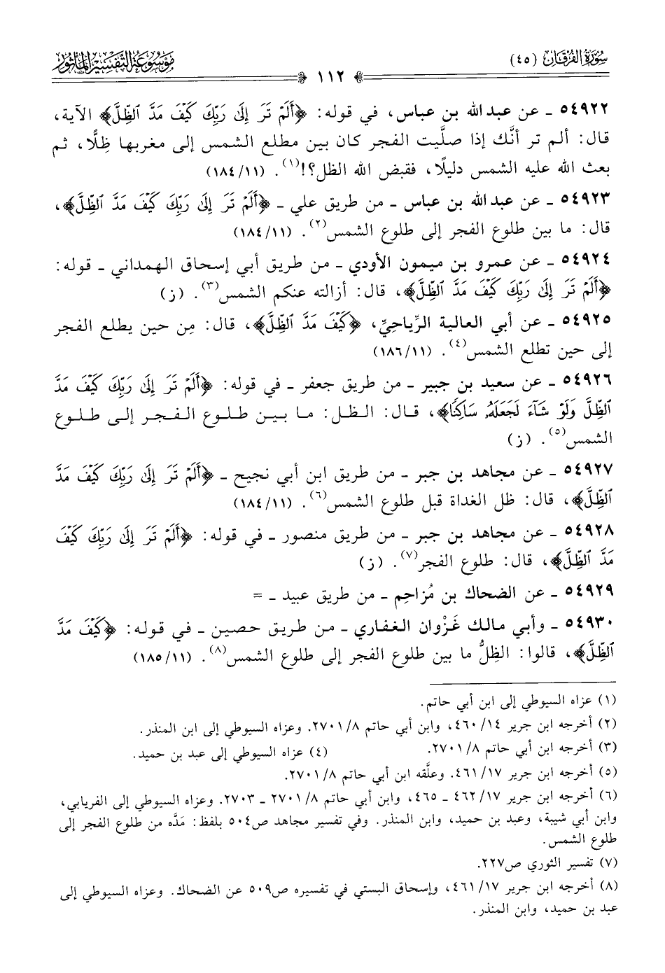٥٤٩٢٣ - عن عبد الله بن عباس -من طريق علي- {ألم تر إلى ربك كيف مد الظل}، قال: ما بين طلوع الفجر إلى طلوع الشمس (¬٢). (١١/ ١٨٤)