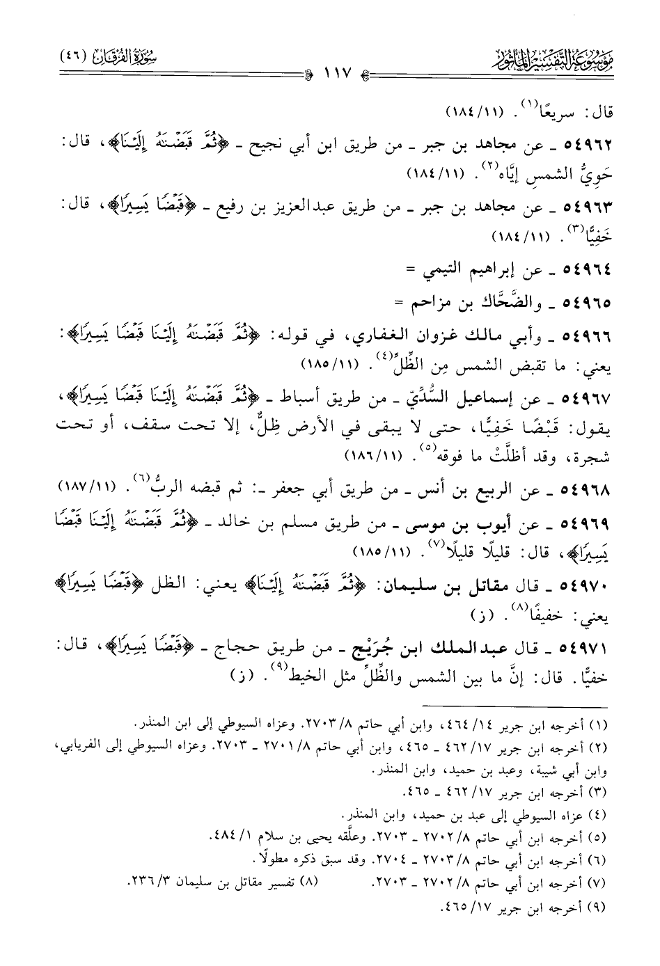 ٥٤٩٦٦ - وأبي مالك غزوان الغفاري، في قوله: {ثم قبضناه الينا قبضا يسيرا}: يعني: ما تقبض الشمس مِن الظِّلِّ (¬٤). (١١/ ١٨٥)