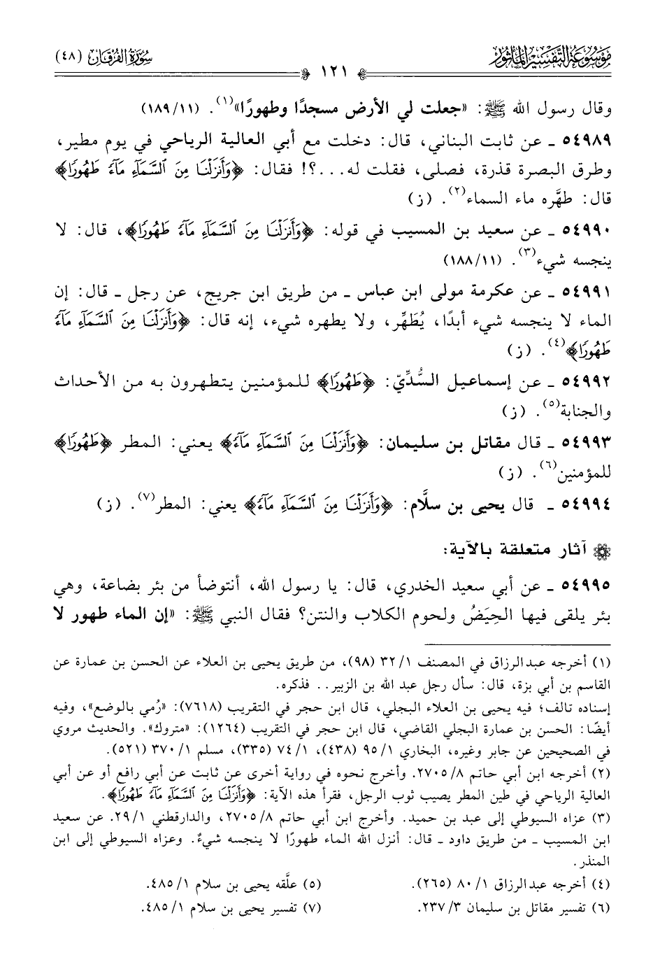٥٤٩٩٢ - عن إسماعيل السُّدِّيّ: {طهورا} للمؤمنين يتطهرون به من الأحداث والجنابة (¬٥). (ز)