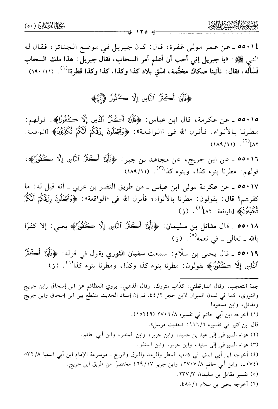 ٥٥٠١٩ - قال يحيى بن سلّام: سمعت سفيان الثوري يقول في قوله: {فأبى أكثر الناس إلا كفورا} يقولون: مطرنا بنوء كذا وكذا، ومطرنا بنوء كذا (¬٦). (ز)