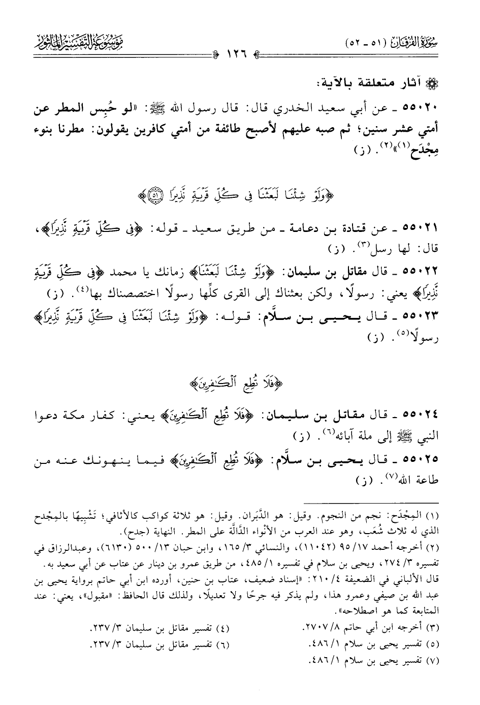 ٥٥٠٢٣ - قال يحيى بن سلّام: قوله: {ولو شئنا لبعثنا في كل قرية نذيرا} رسولًا (¬٥). (ز)