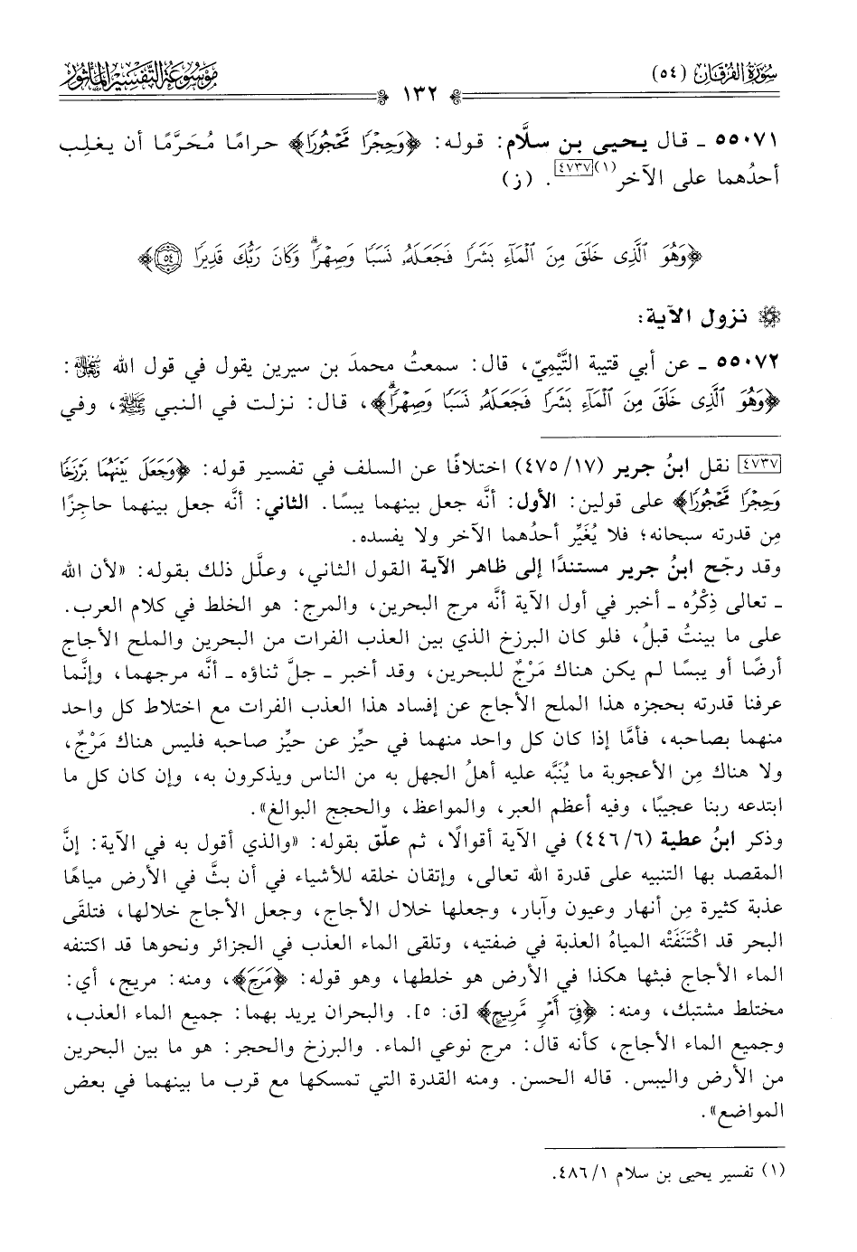 [٤٧٣٧] نقل ابنُ جرير (١٧/ ٤٧٥) اختلافًا عن السلف في تفسير قوله: {وجعل بينهما برزخا وحجرا محجورا} على قولين: الأول: أنّه جعل بينهما يبسًا. الثاني: أنّه جعل بينهما حاجِزًا مِن قدرته سبحانه؛ فلا يُغَيِّر أحدُهما الآخر ولا يفسده.