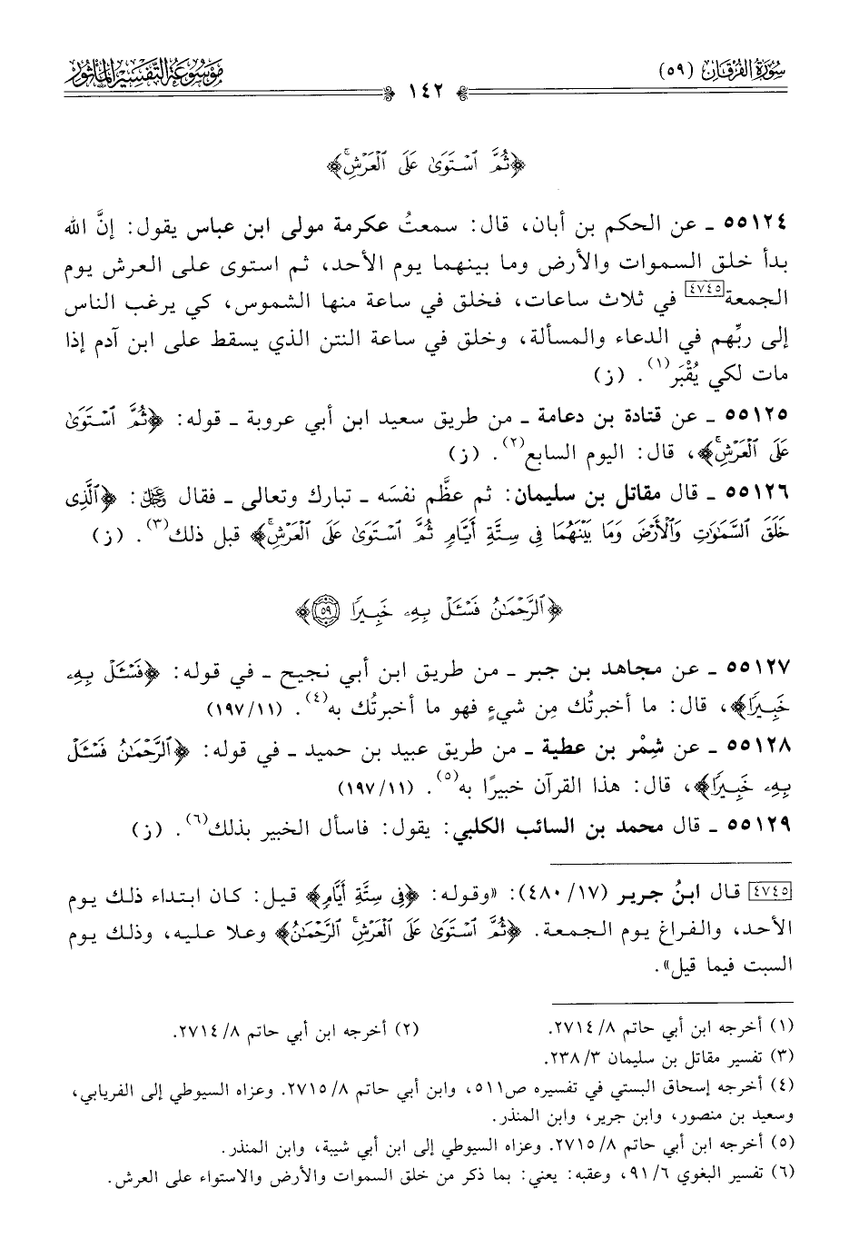 ٥٥١٢٥ - عن قتادة بن دعامة -من طريق سعيد ابن أبي عروبة- قوله: {ثم استوى على العرش}، قال: اليوم السابع (¬٢). (ز)