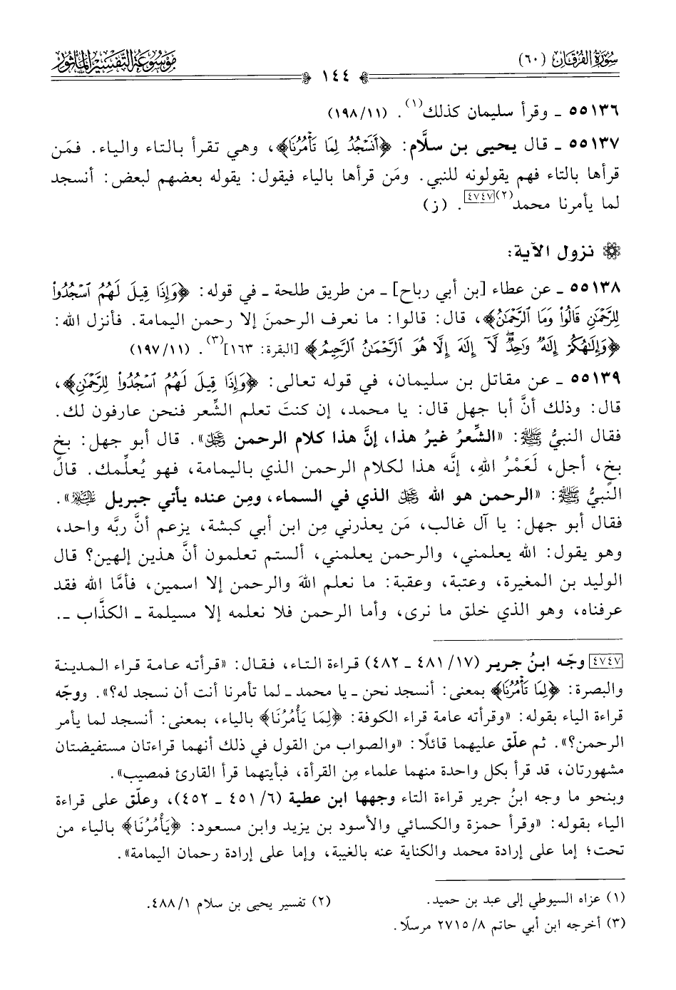 ٥٥١٣٩ - عن مقاتل بن سليمان، في قوله تعالى: {وإذا قيل لهم اسجدوا للرحمن}، قال: وذلك أنّ أبا جهل قال: يا محمد، إن كنتَ تعلم الشِّعر فنحن عارفون لك. فقال النبيُّ - صلى الله عليه وسلم -: «الشِّعرُ غيرُ هذا، إنّ هذا كلام الرحمن - عز وجل -». قال أبو جهل: بخٍ بخٍ، أجل، لَعَمْرُ اللهِ، إنّه هذا لكلام الرحمن الذي باليمامة، فهو يُعلِّمك. قال النبيُّ - صلى الله عليه وسلم -: «الرحمن هو الله - عز وجل - الذي في السماء، ومِن عنده يأتي جبريل - عليه السلام -». فقال أبو جهل: يا آل غالب، مَن يعذرني مِن ابن أبي كبشة، يزعم أنّ ربَّه واحد، وهو يقول: الله يعلمني، والرحمن يعلمني، ألستم تعلمون أنّ هذين إلهين؟ قال الوليد بن المغيرة، وعتبة، وعقبة: ما نعلم اللهَ والرحمن إلا اسمين، فأمّا الله فقد عرفناه، وهو الذي خلق ما نرى، وأما الرحمن فلا نعلمه إلا مسيلمة -الكذّاب-.