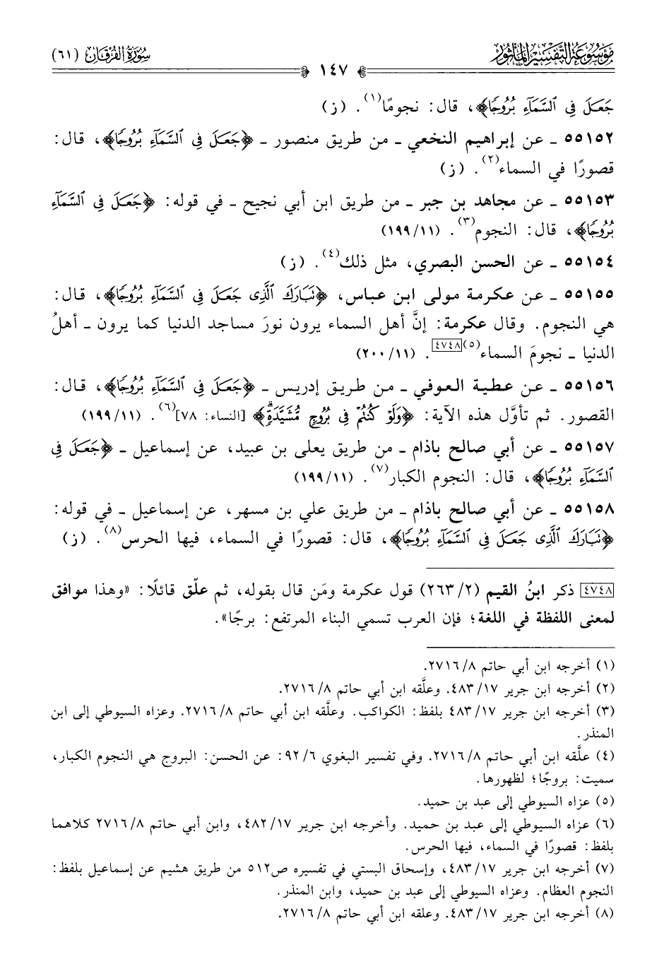٥٥١٥٣ - عن مجاهد بن جبر -من طريق ابن أبي نجيح- في قوله: {جعل في السماء بروجا}، قال: النجوم (¬٣). (١١/ ١٩٩)
