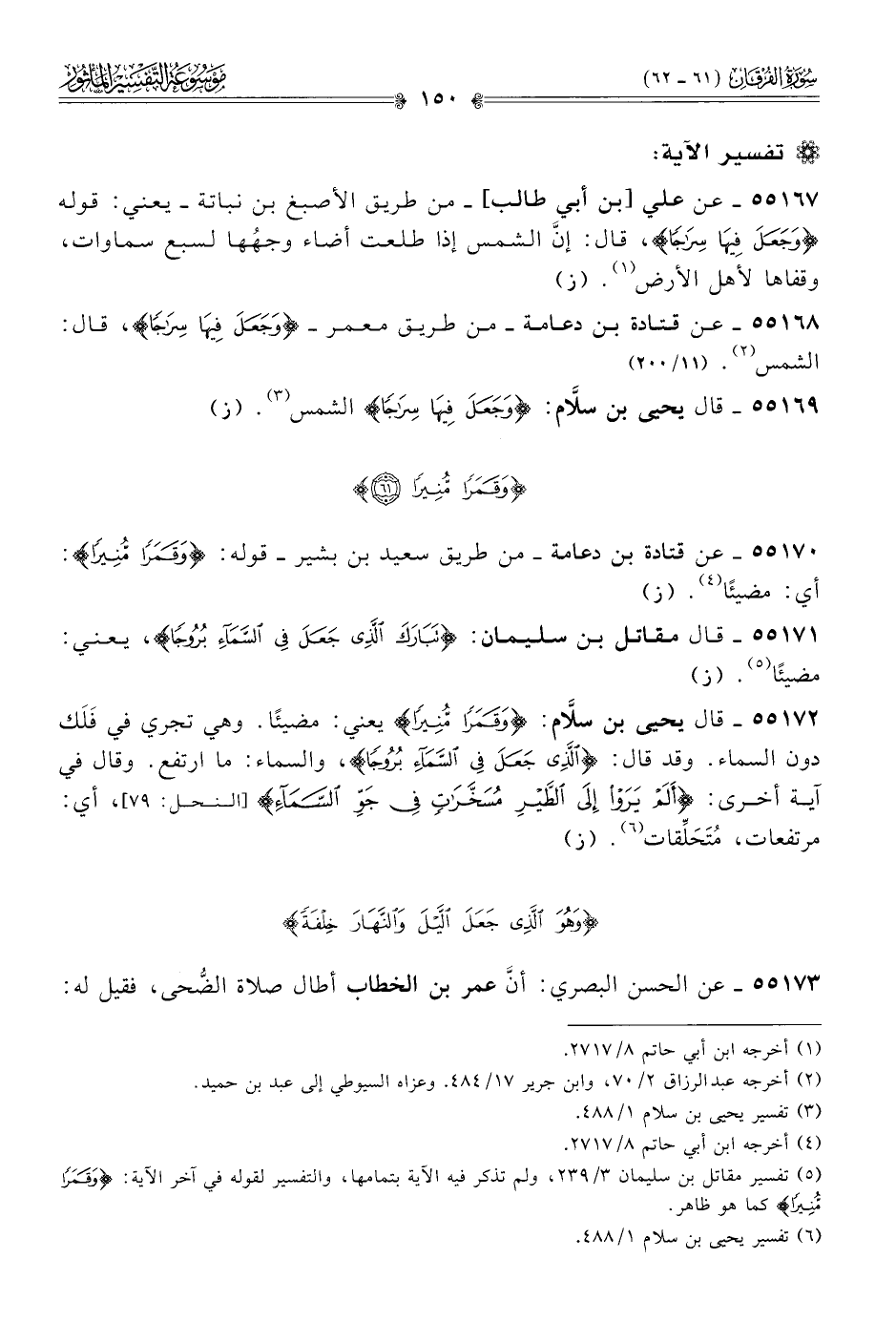 ٥٥١٦٨ - عن قتادة بن دعامة -من طريق معمر- {وجعل فيها سراجا}، قال: الشمس (¬٢). (١١/ ٢٠٠)
