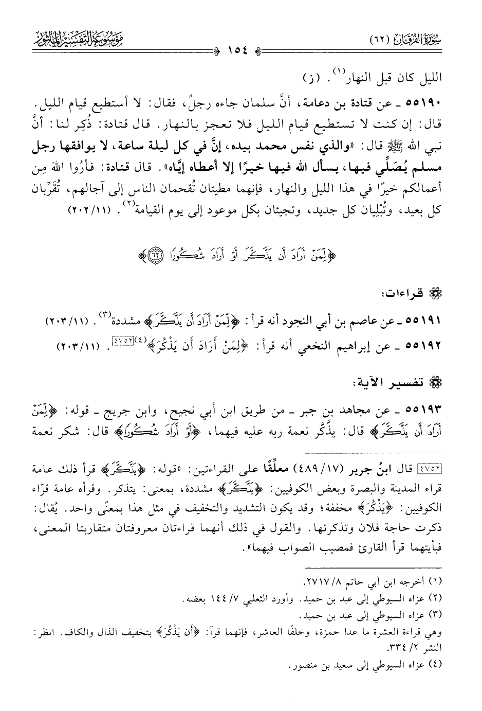 ٥٥١٩٣ - عن مجاهد بن جبر -من طريق ابن أبي نجيح، وابن جريج- قوله: {لمن أراد أن يذكر} قال: يذَّكَّر نعمة ربه عليه فيهما، {أو أراد شكورا} قال: شكر نعمة