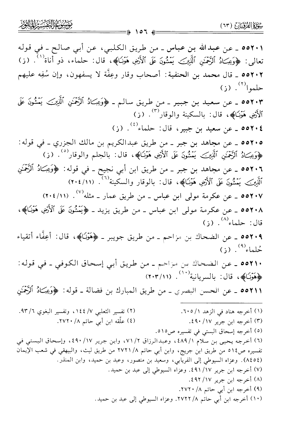 ٥٥٢٠٣ - عن سعيد بن جبير -من طريق سالم- {وعباد الرحمن الذين يمشون على الأرض هونا}، قال: بالسكينة والوقار (¬٣). (ز)