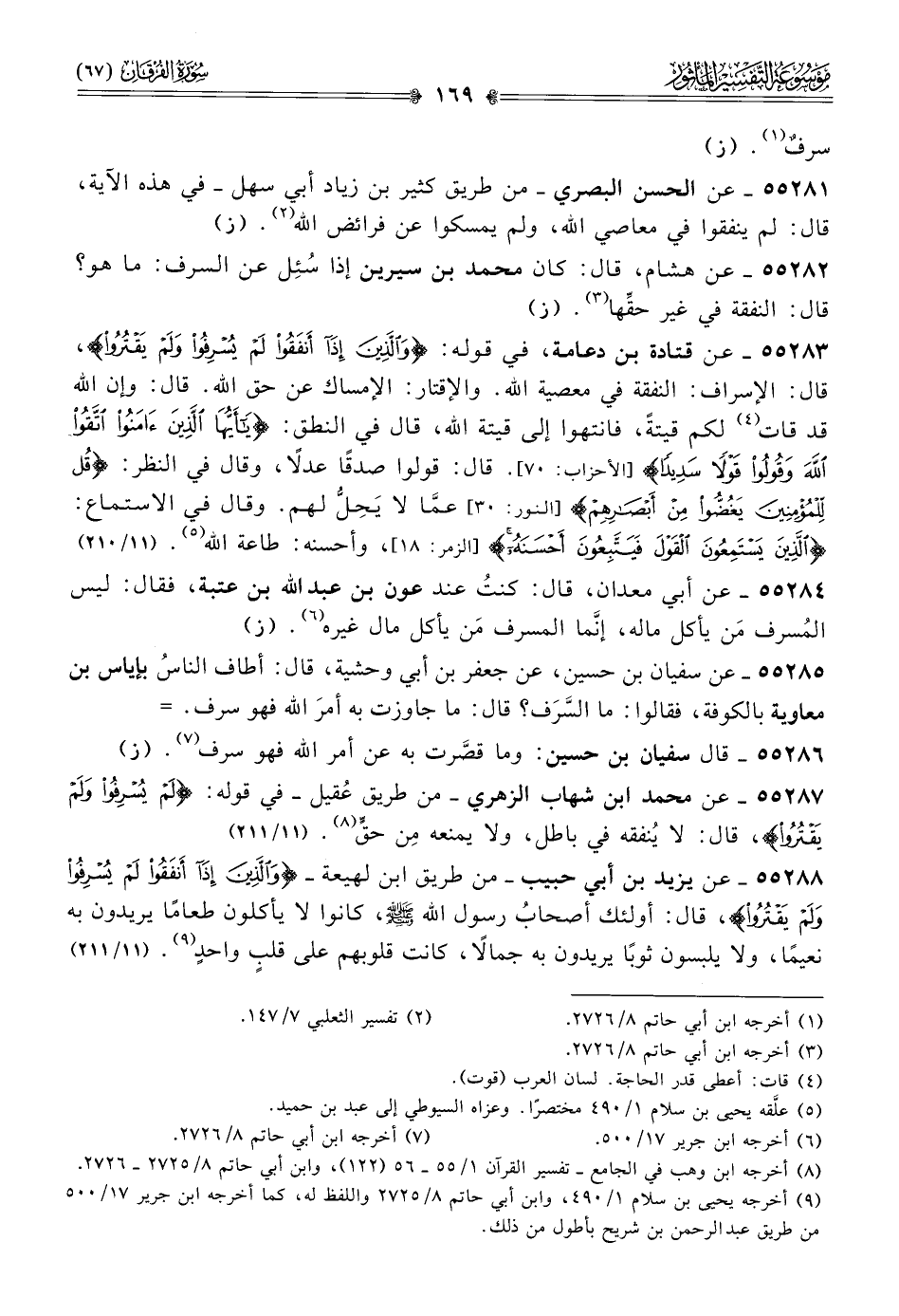 ٥٥٢٨٧ - عن محمد ابن شهاب الزهري- من طريق عُقيل- في قوله: {لم يسرفوا ولم يقتروا}، قال: لا يُنفقه في باطل، ولا يمنعه مِن حقٍّ (¬٨). (١١/ ٢١١)