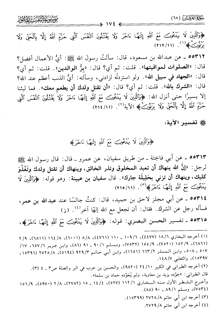 ٥٥٣١٣ - عن أبي فاخِتة -من طريق سفيان، عن عمرو- قال: قال رسول الله - صلى الله عليه وسلم - لرجل: «إنّ الله ينهاك أن تعبد المخلوق وتذر الخالق، وينهاك أن تقتل ولدك وتَغْذُوَ كلبك، وينهاك أن تزني بحَلِيلَة جارك». قال سفيان بن عيينة: وهو قوله: {والذين لا يدعون مع الله إلها اخر} (¬٣). (١١/ ٢١٥)