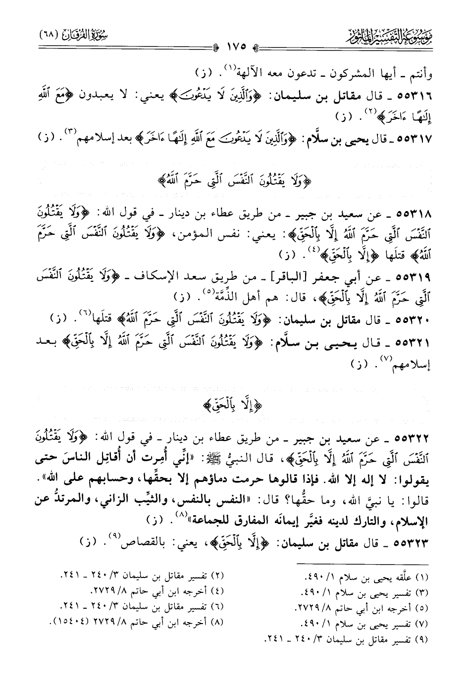 ٥٥٣١٨ - عن سعيد بن جبير -من طريق عطاء بن دينار- في قول الله: {ولا يقتلون النفس التي حرم الله إلا بالحق}: يعني: نفس المؤمن، {ولا يقتلون النفس التي حرم الله} قتلَها {إلا بالحق} (¬٤). (ز)