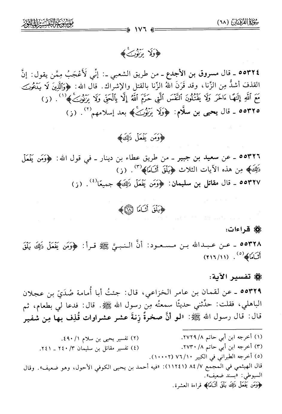 ٥٥٣٢٨ - عن عبد الله بن مسعود: أنّ النبيَّ - صلى الله عليه وسلم - قرأ: {ومَن يَفْعَلْ ذَلِكَ يَلْقَ أثامًا} (¬٥). (١١/ ٢١٦)