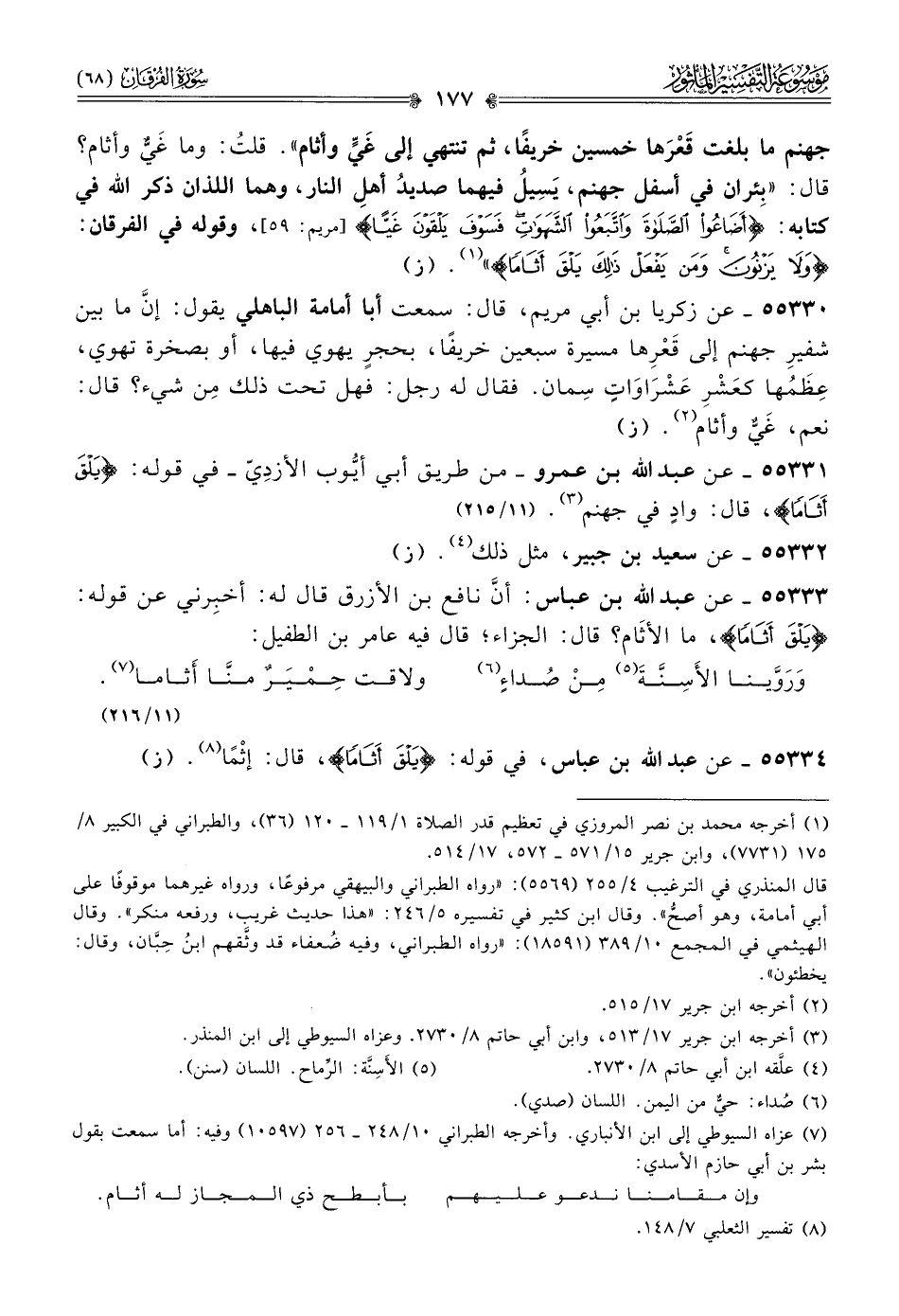 ٥٥٣٣٣ - عن عبد الله بن عباس: أنّ نافع بن الأزرق قال له: أخبِرني عن قوله: {يلق أثاما}، ما الأثام؟ قال: الجزاء؛ قال فيه عامر بن الطفيل: