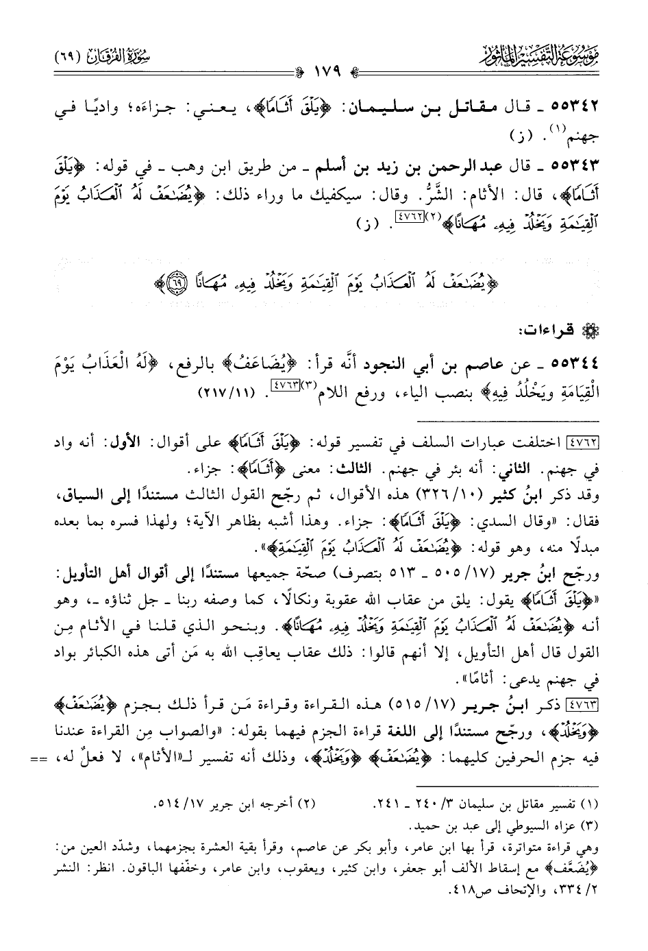 ٥٥٣٤٣ - قال عبد الرحمن بن زيد بن أسلم -من طريق ابن وهب- في قوله: {يلق أثاما}، قال: الأثام: الشَّرُّ. وقال: سيكفيك ما وراء ذلك: {يضاعف له العذاب يوم القيامة ويخلد فيه مهانا} (¬٢) [٤٧٦٢]. (ز)