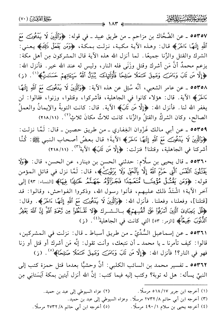 ٥٥٣٥٩ - عن أبي مالك غَزْوان الغِفاري -من طريق حصين- قال: لَمّا نزلت: {والذين لا يدعون مع الله الها آخر} الآيةَ؛ قال بعضُ أصحاب النبي - صلى الله عليه وسلم -: كُنّا أشركنا في الجاهلية، وقتلنا! فنزلت: {إلا من تاب} الآية (¬٣). (١١/ ٢١٨)