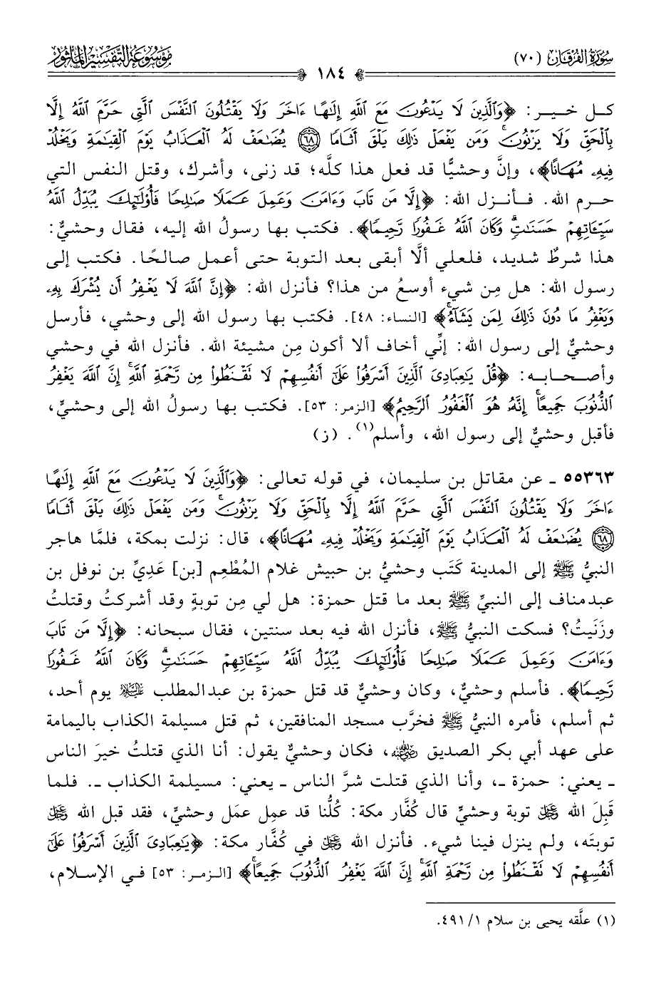 ٥٥٣٦٣ - عن مقاتل بن سليمان، في قوله تعالى: {والذين لا يدعون مع الله إلها آخر ولا يقتلون النفس التي حرم الله إلا بالحق ولا يزنون ومن يفعل ذلك يلق أثاما يضاعف له العذاب يوم القيامة ويخلد فيه مهانا}، قال: نزلت بمكة، فلمّا هاجر النبيُّ - صلى الله عليه وسلم - إلى المدينة كَتَب وحشيُّ بن حبيش غلام المُطْعِم [بن] عَدِيِّ بن نوفل بن عبد مناف إلى النبيِّ - صلى الله عليه وسلم - بعد ما قتل حمزة: هل لي مِن توبةٍ وقد أشركتُ وقتلتُ وزَنَيتُ؟ فسكت النبيُّ - صلى الله عليه وسلم -، فأنزل الله فيه بعد سنتين، فقال سبحانه: {إلا من تاب وآمن وعمل عملا صالحا فأولئك يبدل الله سيئاتهم حسنات وكان الله غفورا رحيما}. فأسلم وحشيٌّ، وكان وحشيٌّ قد قتل حمزة بن عبد المطلب - عليه السلام - يوم أحد، ثم أسلم، فأمره النبيُّ - صلى الله عليه وسلم - فخرَّب مسجد المنافقين، ثم قتل مسيلمة الكذاب باليمامة على عهد أبي بكر الصديق?، فكان وحشيٌّ يقول: أنا الذي قتلتُ خيرَ الناس -يعني: حمزة-، وأنا الذي قتلت شرَّ الناس -يعني: مسيلمة الكذاب-. فلما قَبِلَ الله - عز وجل - توبة وحشيٍّ قال كُفّار مكة: كُلُّنا قد عمِل عمَل وحشيٍّ، فقد قبل الله - عز وجل - توبتَه، ولم ينزل فينا شيء. فأنزل الله - عز وجل - في كُفّار مكة: {يا عبادي الذين أسرفوا على أنفسهم لا تقنطوا من رحمة الله إن الله يغفر الذنوب جميعا} [الزمر: ٥٣] في الإسلام،