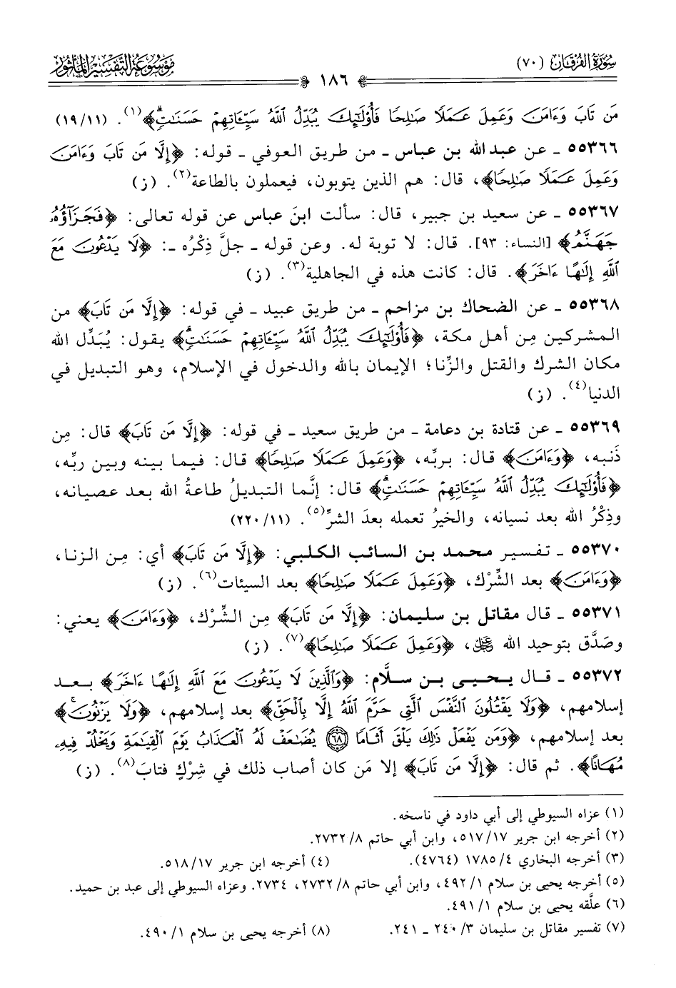 ٥٥٣٦٩ - عن قتادة بن دعامة -من طريق سعيد- في قوله: {إلا من تاب} قال: مِن ذَنبه، {وآمن} قال: بربِّه، {وعمل عملا صالحا} قال: فيما بينه وبين ربِّه، {فأولئك يبدل الله سيئاتهم حسنات} قال: إنّما التبديلُ طاعةُ الله بعد عصيانه، وذِكْرُ الله بعد نسيانه، والخيرُ تعمله بعدَ الشرِّ (¬٥). (١١/ ٢٢٠)