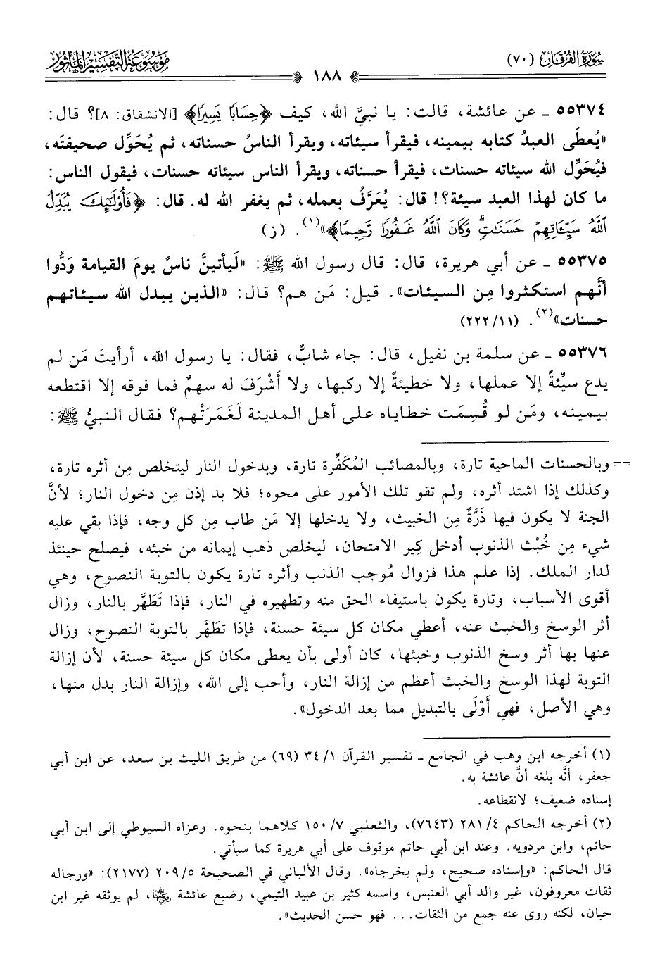 ٥٥٣٧٤ - عن عائشة، قالت: يا نبيَّ الله، كيف {حسابا يسيرا} [الانشقاق: ٨]؟ قال: «يُعطى العبدُ كتابه بيمينه، فيقرأ سيئاته، ويقرأ الناسُ حسناته، ثم يُحَوِّل صحيفتَه، فيُحَوِّل الله سيئاته حسنات، فيقرأ حسناته، ويقرأ الناس سيئاته حسنات، فيقول الناس: ما كان لهذا العبد سيئة؟! قال: يُعَرَّفُ بعمله، ثم يغفر الله له. قال: {أولئك يبدل الله سيئاتهم حسنات وكان الله غفورا رحيما}» (¬١). (ز)