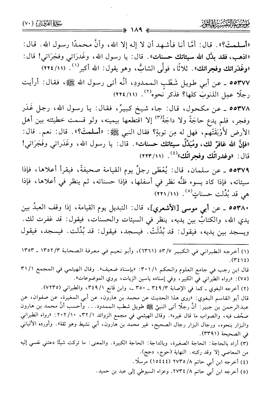 «أسلمتَ؟». قال: أمّا أنا فأشهد أن لا إله إلا الله، وأنّ محمدًا رسول الله. قال: «اذهب، فقد بدَّل الله سيئاتك حسنات». قال: يا رسول الله، وغَدراتي وفجَراتي! قال: «وغَدَراتك وفجراتك». ثلاثًا، فولّى الشابُّ، وهو يقول: الله أكبر (¬١). (١١/ ٢٢٤)