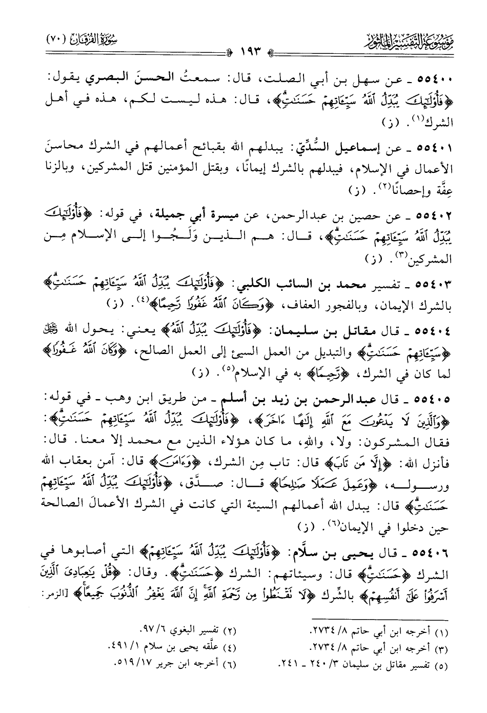 ٥٥٤٠٦ - قال يحيى بن سلّام: {فأولئك يبدل الله سيئاتهم} التي أصابوها في الشرك {حسنات} قال: وسيئاتهم: الشرك {حسنات}. وقال: {قل يا عبادي الذين أسرفوا على أنفسهم} بالشِّرك {لا تقنطوا من رحمة الله إن الله يغفر الذنوب جميعا} [الزمر: