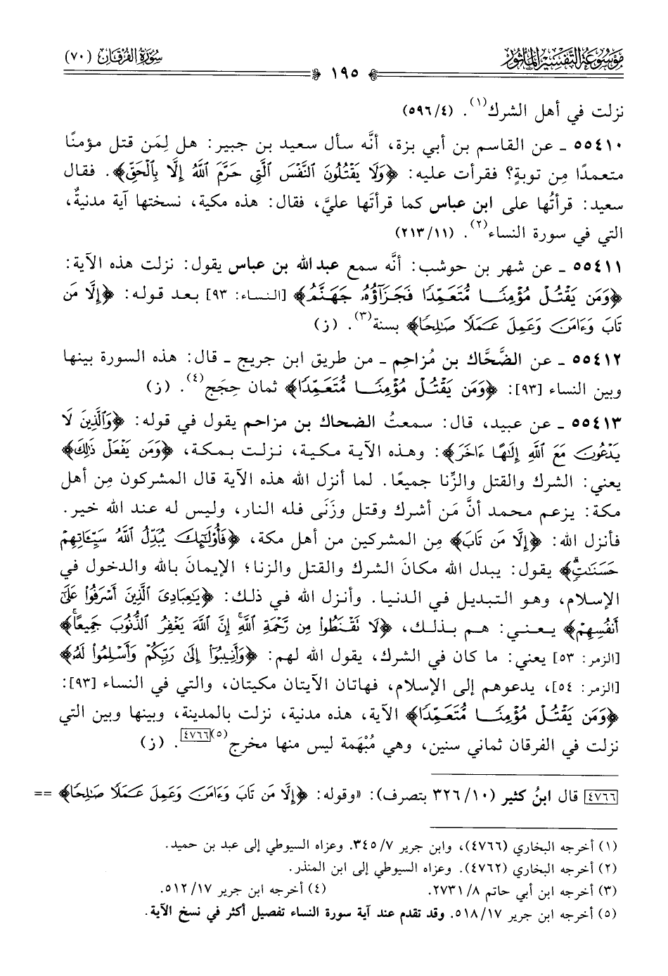٥٥٤١٠ - عن القاسم بن أبي بزة، أنّه سأل سعيد بن جبير: هل لِمَن قتل مؤمنًا متعمدًا مِن توبةٍ؟ فقرأت عليه: {ولا يقتلون النفس التي حرم الله إلا بالحق}. فقال سعيد: قرأتُها على ابن عباس كما قرأتَها عليَّ، فقال: هذه مكية، نسختها آية مدنيةٌ، التي في سورة النساء (¬٢). (١١/ ٢١٣)