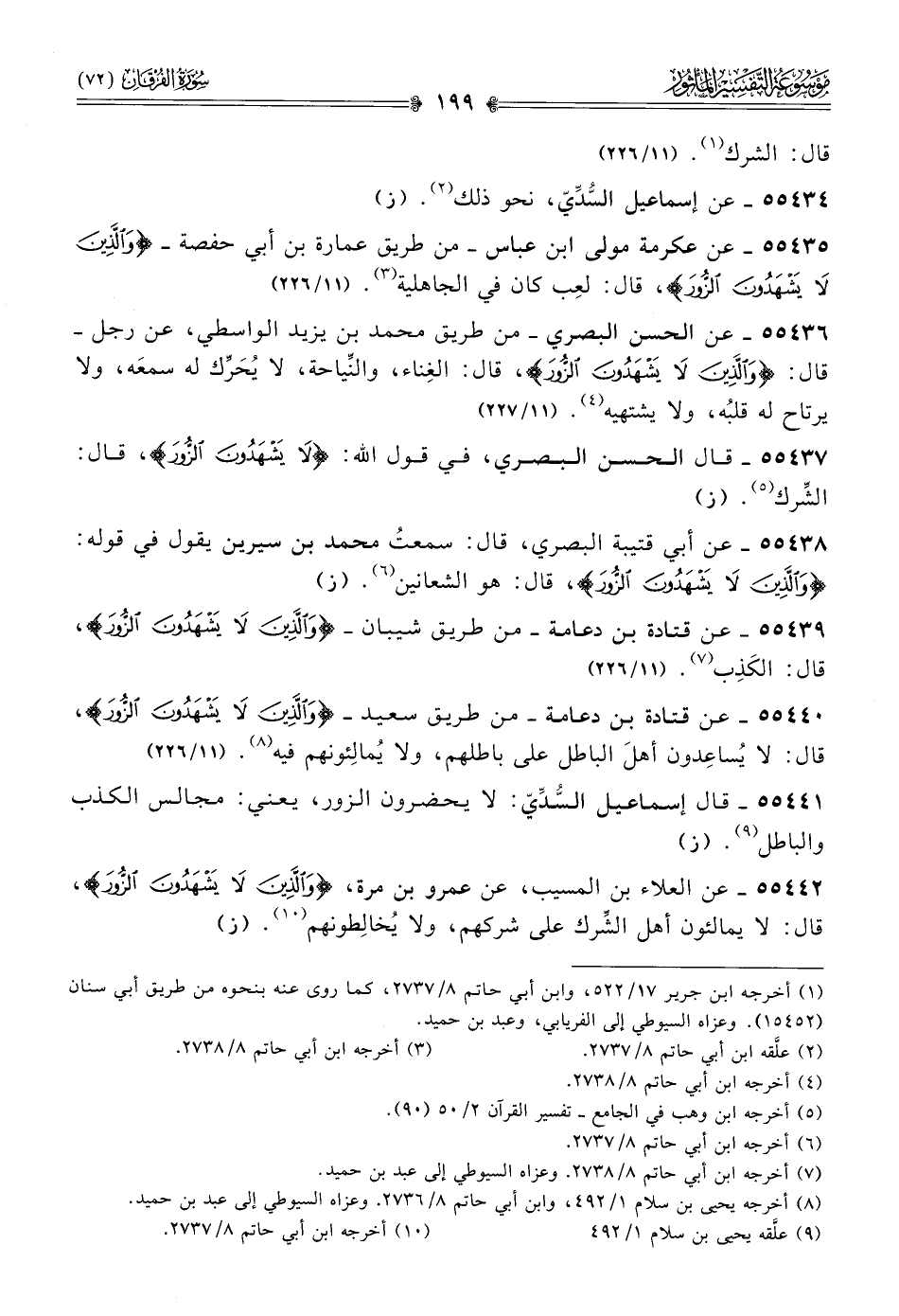 ٥٥٤٣٧ - قال الحسن البصري، في قول الله: {لا يشهدون الزور}، قال: الشِّرك (¬٥). (ز)