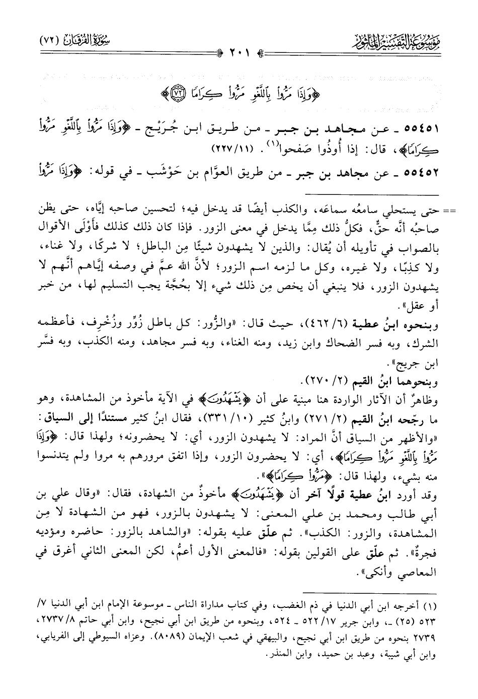 ٥٥٤٥١ - عن مجاهد بن جبر -من طريق ابن جُرَيْج- {واذا مروا باللغو مروا كراما}، قال: إذا أُوذُوا صَفحوا (¬١). (١١/ ٢٢٧)
