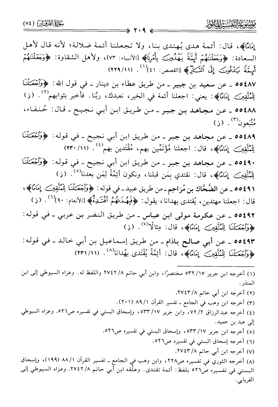 ٥٥٤٨٩ - عن مجاهد بن جبر -من طريق ابن أبي نجيح- في قوله: {واجعلنا للمتقين اماما}، قال: اجعلنا مُؤْتَمِّين بهم، مُقْتَدين بهم (¬٤). (١١/ ٢٣٠)