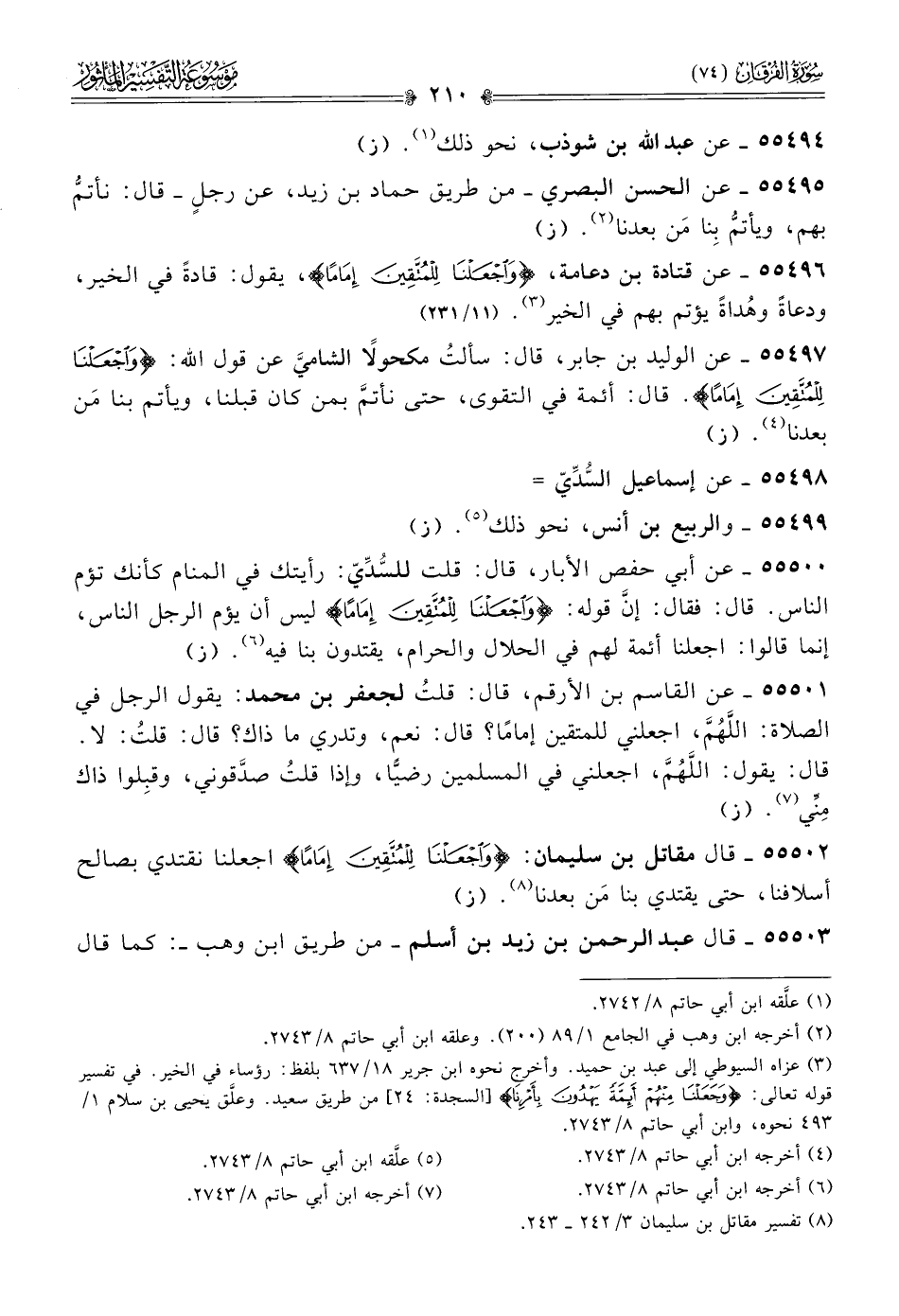 ٥٥٤٩٧ - عن الوليد بن جابر، قال: سألتُ مكحولًا الشاميَّ عن قول الله: {واجعلنا للمتقين إماما}. قال: أئمة في التقوى، حتى نأتمَّ بمن كان قبلنا، ويأتم بنا مَن بعدنا (¬٤). (ز)