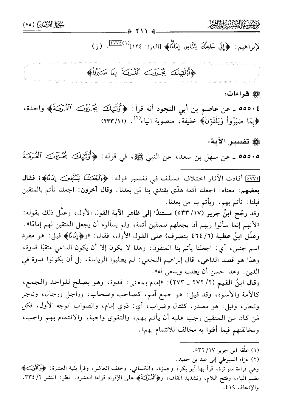 ٥٥٥٠٤ - عن عاصم بن أبي النجود أنه قرأ: {أُولَئِكَ يُجْزَوْنَ الغُرْفَةَ} واحدة، «بِما صَبَرُواْ ويَلْقَوْنَ» خفيفة، منصوبة الياء (¬٢). (١١/ ٢٣٣)