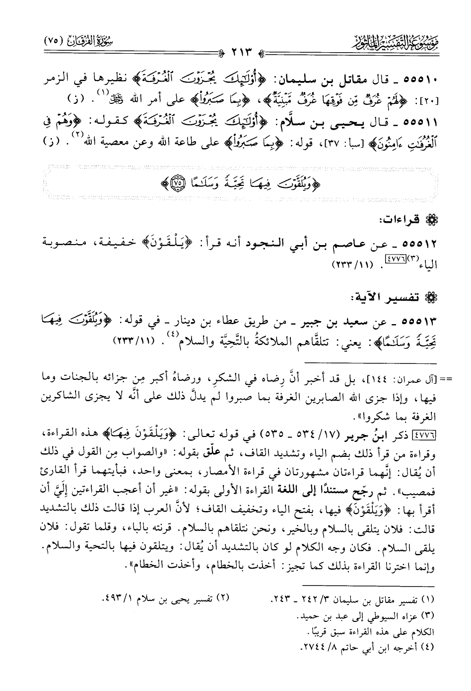 ٥٥٥١٣ - عن سعيد بن جبير -من طريق عطاء بن دينار- في قوله: {ويلقون فيها تحية وسلاما}: يعني: تتلقّاهم الملائكةُ بالتَّحِيَّة والسلام (¬٤). (١١/ ٢٣٣)