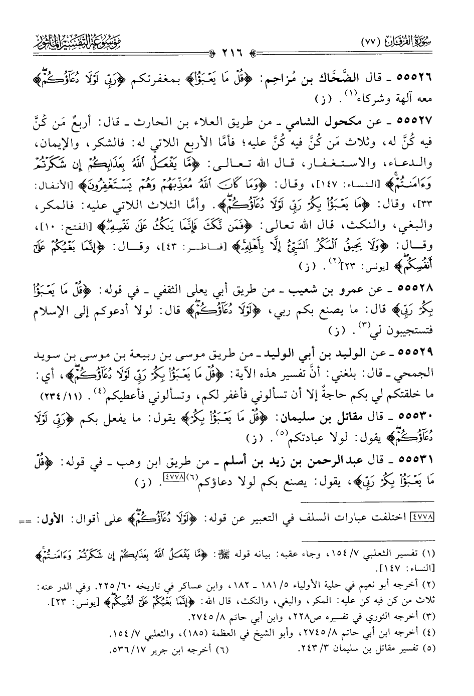 [٤٧٧٨] اختلفت عبارات السلف في التعبير عن قوله: {لولا دعاؤكم} على أقوال: الأول: لولا إيمانكم. الثاني: لولا دعاؤكم إيّاه. الثالث: لولا عبادتكم إيّاه. الرابع: لولا دعاؤه إيّاكم لتعبدوه. الخامس: ما يعبأ ربي بمغفرتكم لولا دعاؤكم معه آلهة وشركاء. السادس: لولا أدعوكم إلى الإسلام فتستجيبون لي.