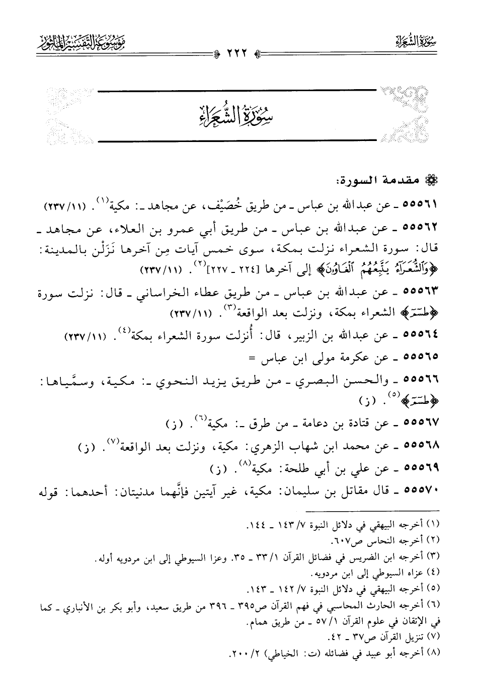 ٥٥٥٦٢ - عن عبد الله بن عباس -من طريق أبي عمرو بن العلاء، عن مجاهد- قال: سورة الشعراء نزلت بمكة، سوى خمس آيات مِن آخرها نَزَلْن بالمدينة: {والشعراء يتبعهم الغاوون} إلى آخرها [٢٢٤ - ٢٢٧] (¬٢). (١١/ ٢٣٧)