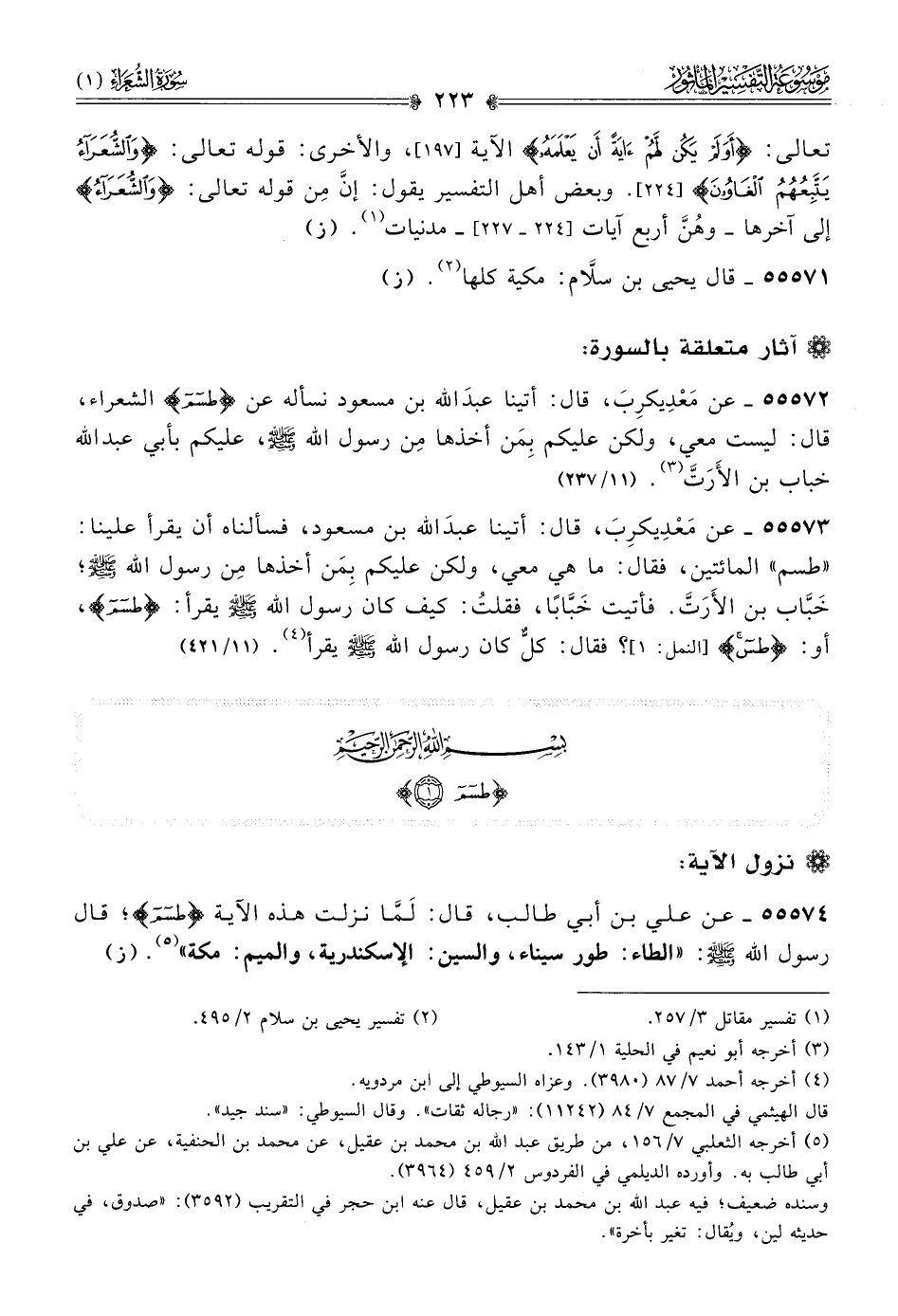 ٥٥٥٧٤ - عن علي بن أبي طالب، قال: لَمّا نزلت هذه الآية {طسم}؛ قال رسول الله - صلى الله عليه وسلم -: «الطاء: طور سيناء، والسين: الإسكندرية، والميم: مكة» (¬٥). (ز)